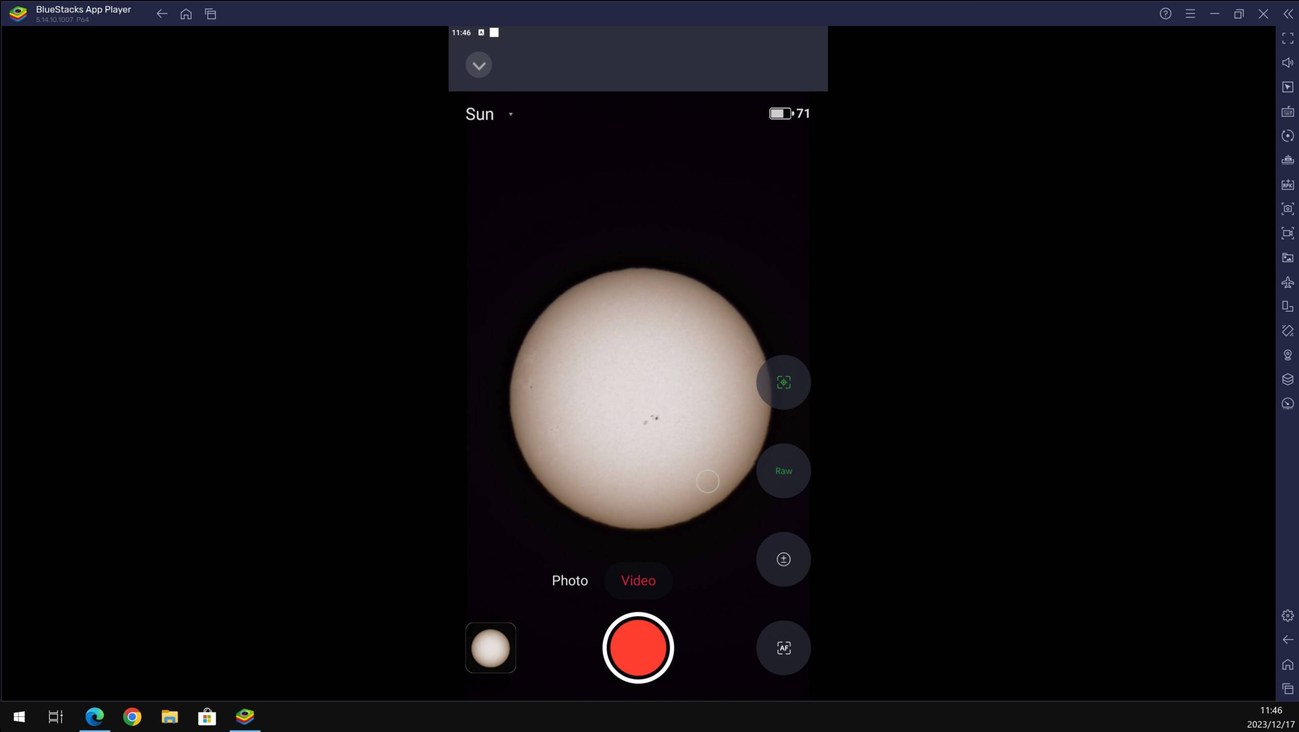 BlueStacks内でSeestarを起動し、太陽アイコンをマウスクリックして太陽導入、スマホ等の動きと同様です。太陽が中心にセットされましたのでOKとし、撮影を進めました。参考に撮影中のPC画面のスクリーンショットを画像3に示します。BlueStacksのメニューで横画面にさらに大きくできるのですがSeestarの操作画面のみで太陽のライブ画像は大きく表示されず小さいままです。