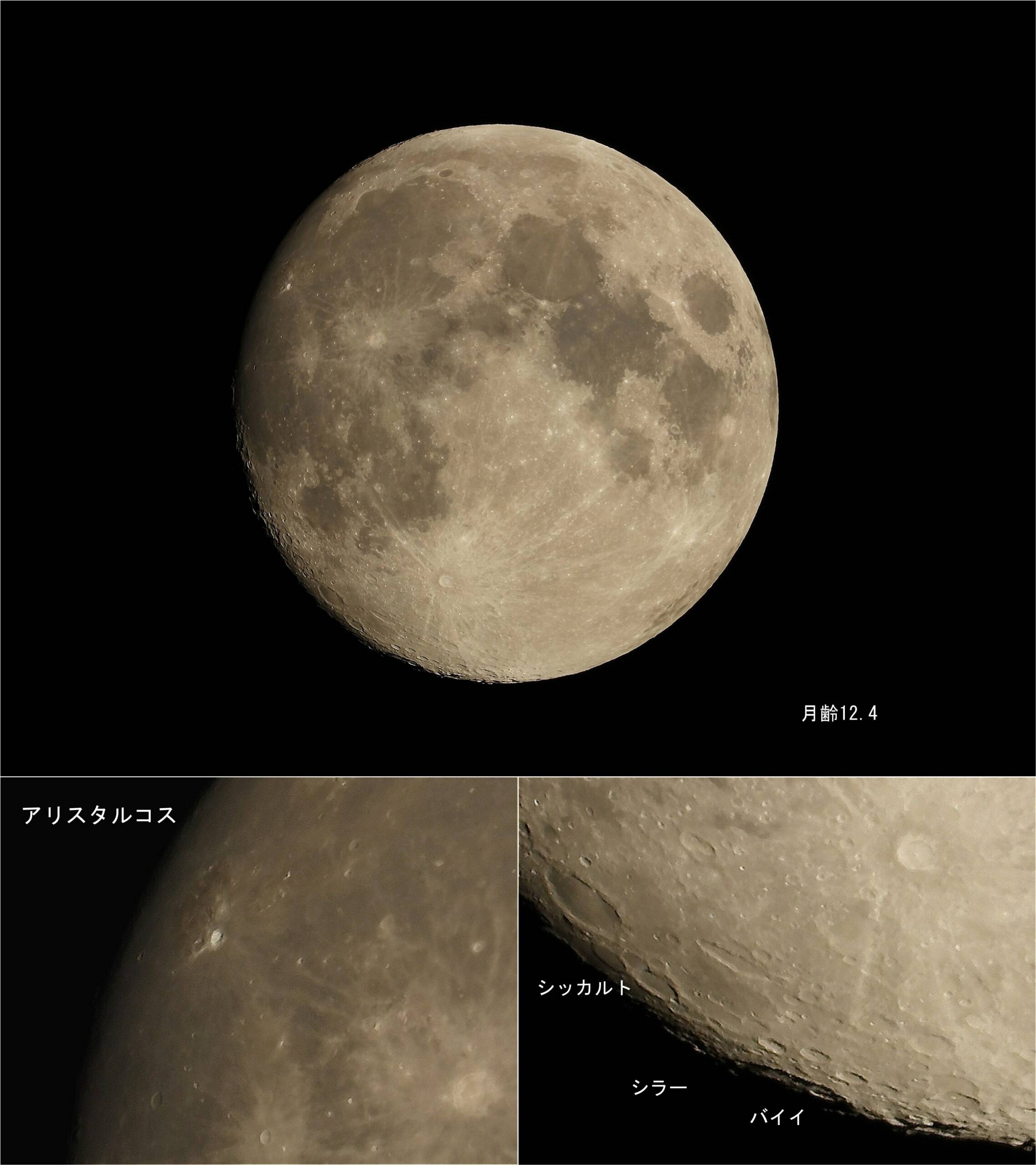 今日月齢13.4辺りで月面Aでも確認しようとしましたが、昨日と変わって、最悪のシーイング、撮影はヒットなし。逆に昨日のシーイングが良かった月齢12.4を編集しました。 画像1にまとめて示します。月全体をモニターで見ているとアリスタルコスが白く目立ちましたので、また、南極方向にバイイなどを。もう少し右側の南極も含めて編集すれば良かったか(回転してトリミングしたのでモレトス、ニュートンも外れてしまいました。回転を考慮して撮れば良かったか)、中途半端。 画像1 月齢12.4 COOLPIX P1000による