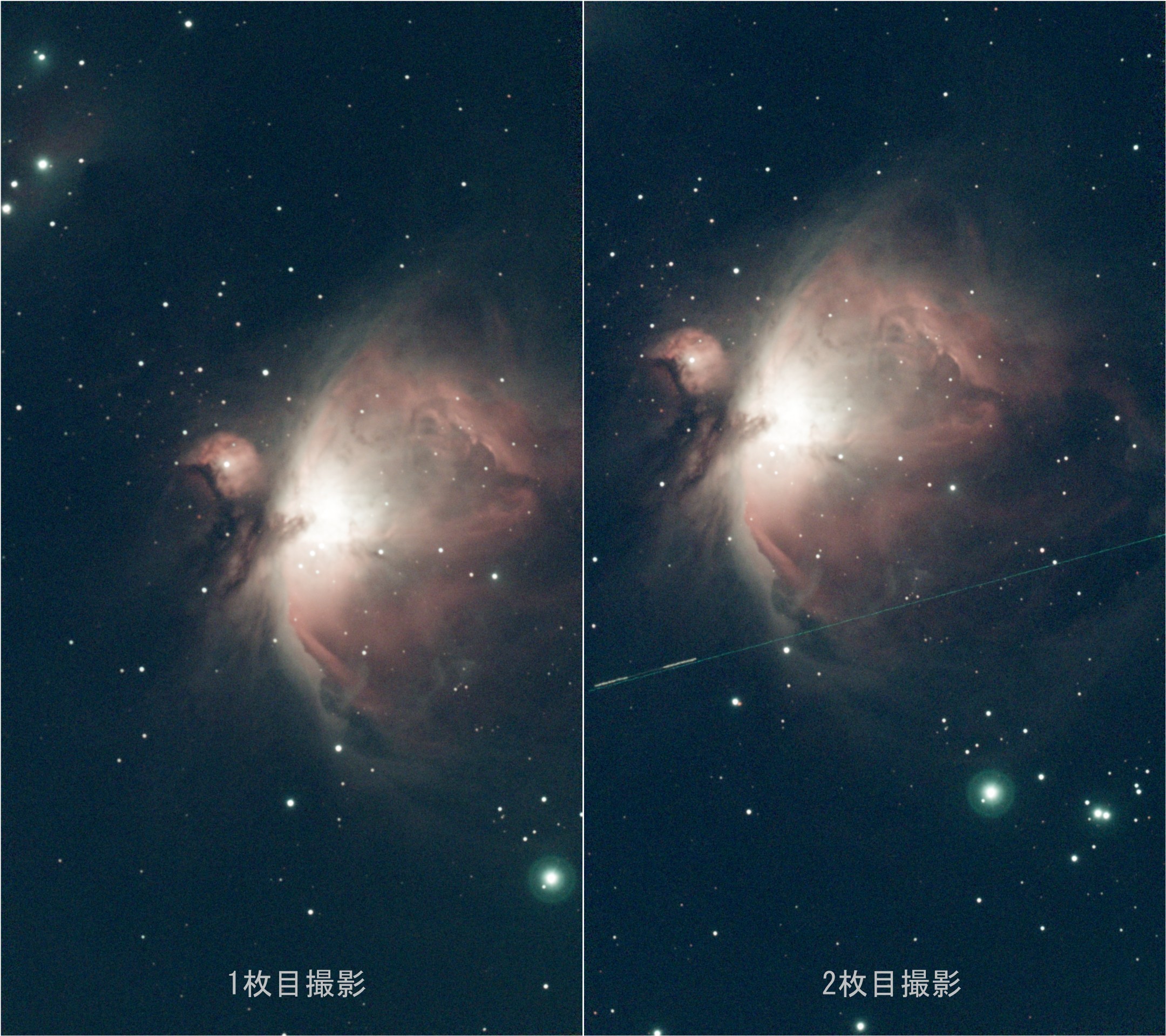画像2 M42のSeestarによるスタック画像1枚目は20:10に終了、2枚目は20:27に終了