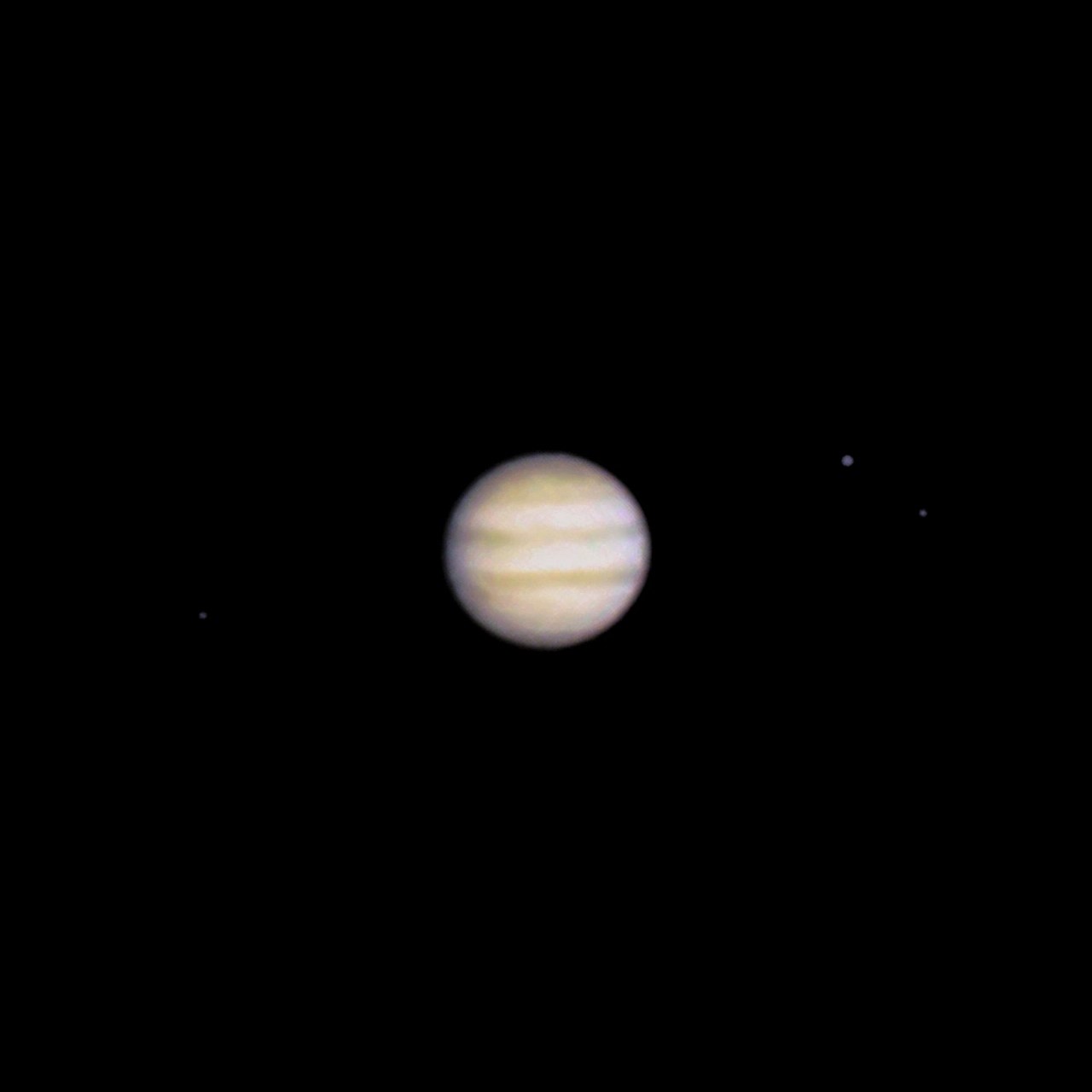 4K原動画からAS!3でスタック、画像調整した一枚を画像1に示します。画像全体は木星南北を縦軸に表示するため回転しています。大赤斑はそれらしき、衛星も集中すれば見えてくると思います。木星右側の明るめの衛星はガニメデ、そのやや右下にイオ、木星左側にはエウロパが見えています。
