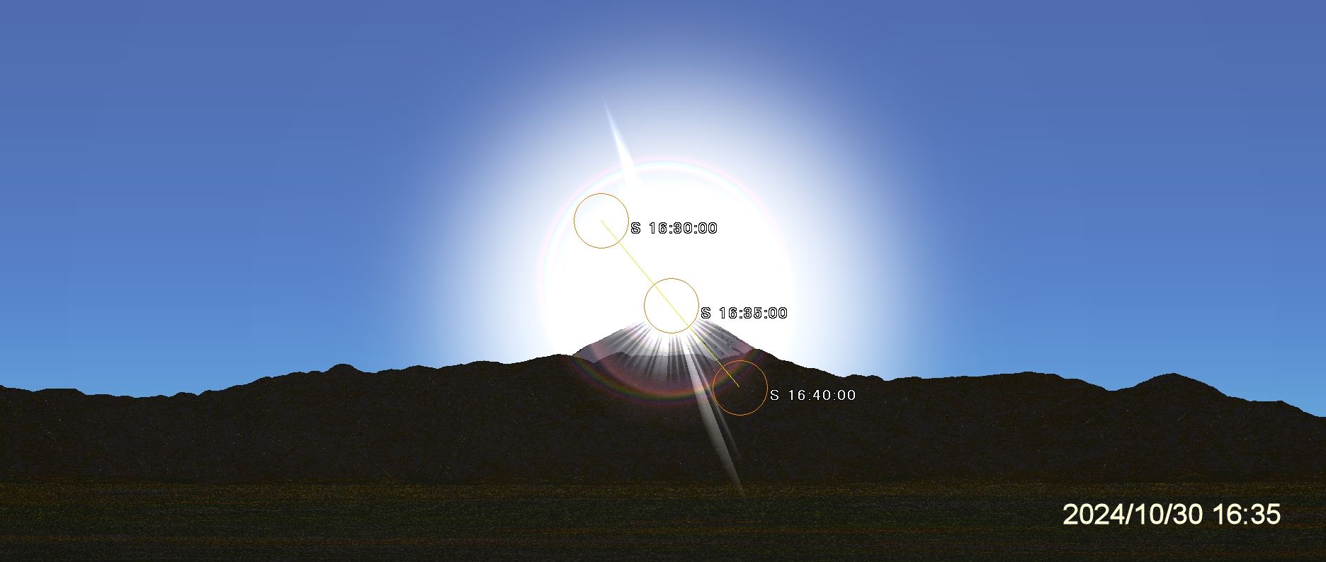 最初に同場所における次回のダイヤモンド富士の成立日時を画像1に示します。年2回チャンスがありますが、今回がその一回でしたが次のチャンスはパラメータサーベイしたところ画像に示しているように2024/10/30 16:35です。同日の16:30~16:40までの太陽の位置を示しています。