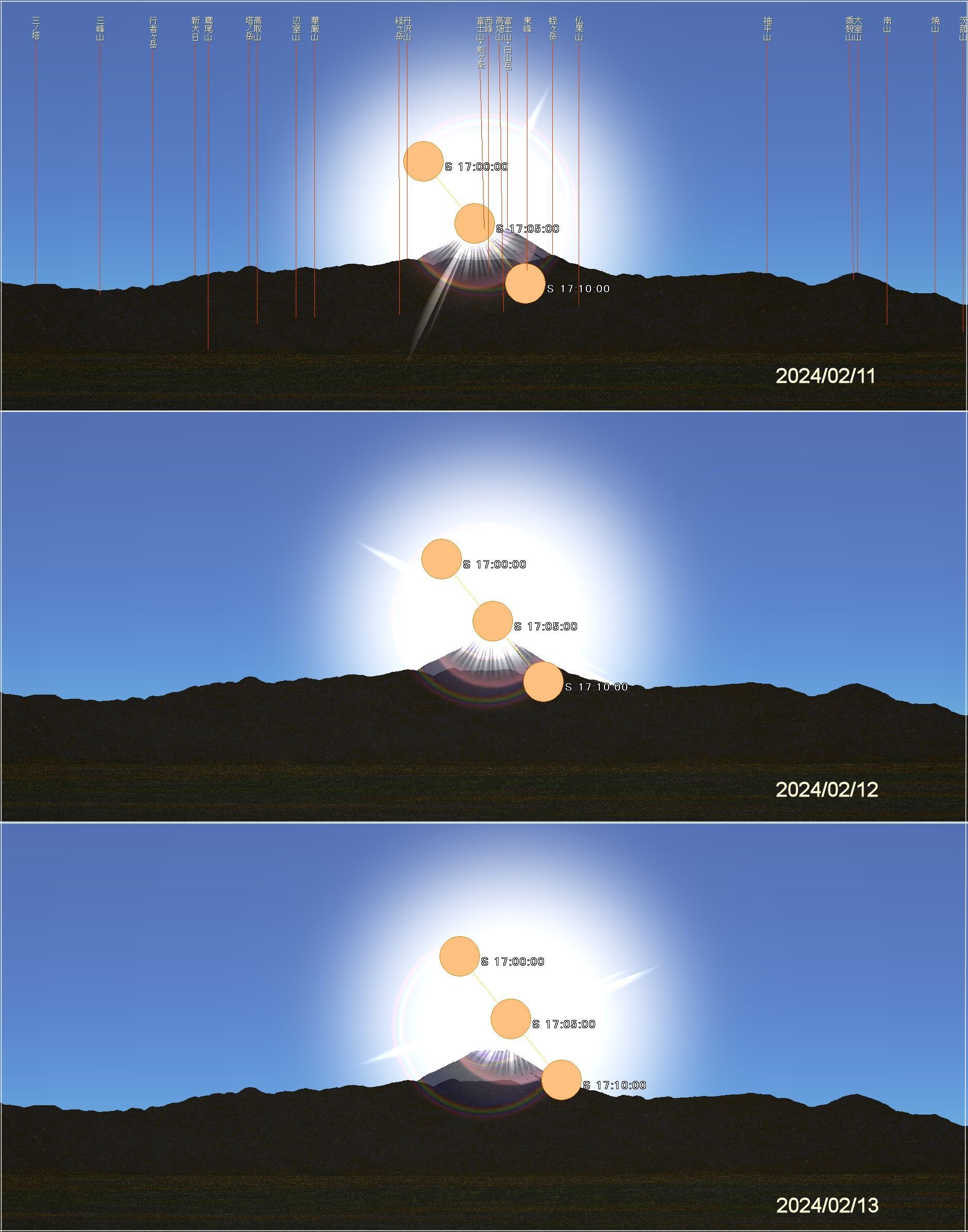 次に昨日2月12日の現象がダイヤモンド富士として最適だったかどうか確認しました。画像2の結果に示すように2/11か2/12が最適だったようです。撮影せず(できず)残念。