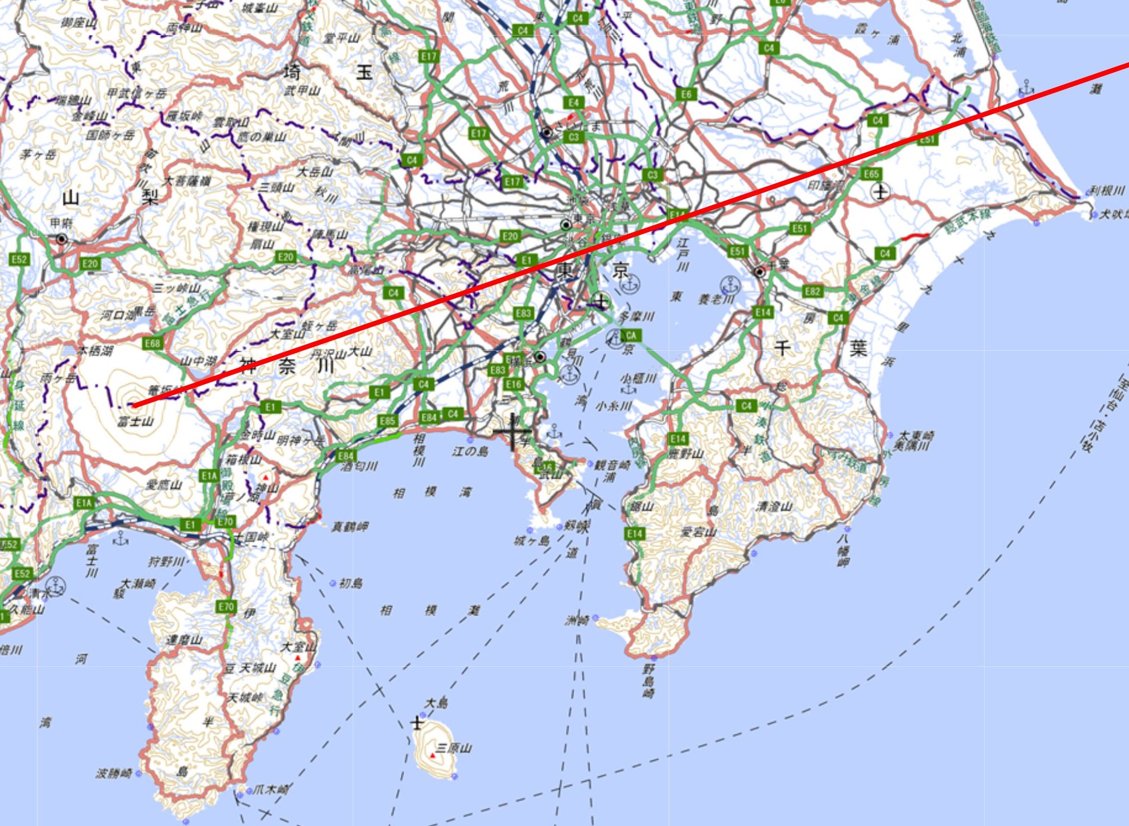 なお、実際の撮影画像は無く、一般的な情報データでもありませんが、このようなシミュレーションでダイヤモンド富士の予想情報が得られる例として再度載せておくことにしました。(追記:ダイヤモンド富士は観察場所-富士山-太陽が一直線に並ぶ時に実現します。本記事中では東京都内としていますが画像3に示すように赤いライン上にある場所であれば同じように見えます。カシミール3Dは任意の場所を設定できます。なお、線引きには国土地理院のマップを使用しています)