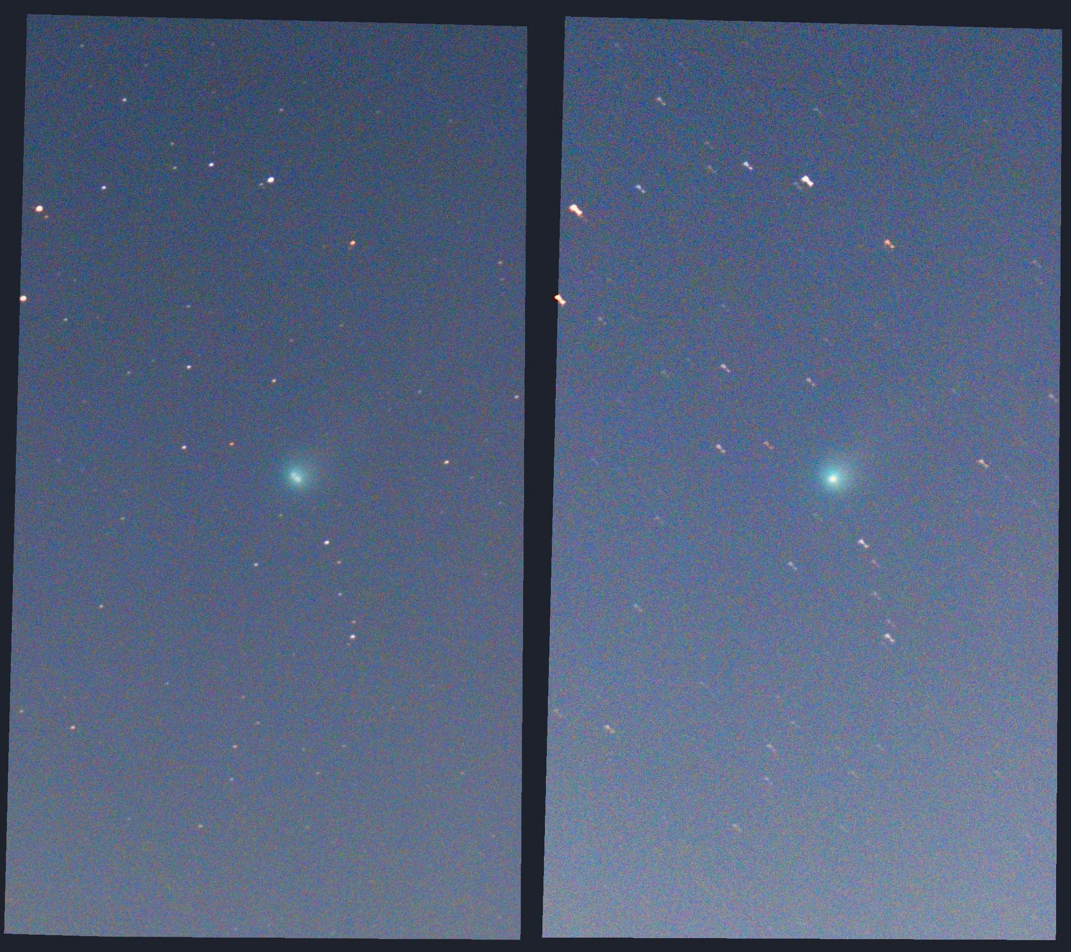 以下はその少ない画像ですがSirilを使用して恒星基準と彗星基準で処理しました。画像1に示します。左は恒星基準、右が彗星基準による編集です。前回より何となく彗星らしさが増しているように見えます。