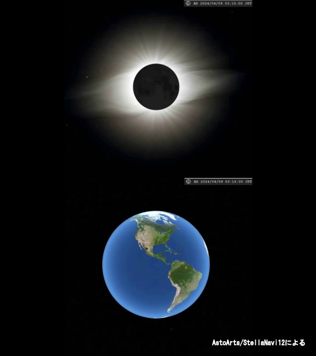 動画1 皆既日食2024/04/08 UT 現地では日昼 メキシコ北部(最大食)からの例(04/09 01:30~05:00 JSTで表示) StellaNavigator12による 赤道座標表示