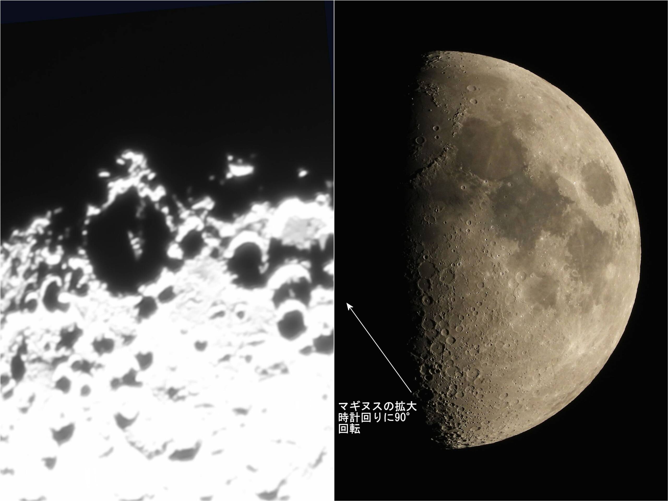 この月齢になると月面文字Xはタイミングを過ぎてしまいますが、それに続いてマギヌスクレーター内の真っ暗な影の中にRay現象により光が射し込み”マギヌスの魔女”の顔が現れます。過去に数度撮影しています。太陽の光が射し込む方向、角度によりその顔の形が変化します。