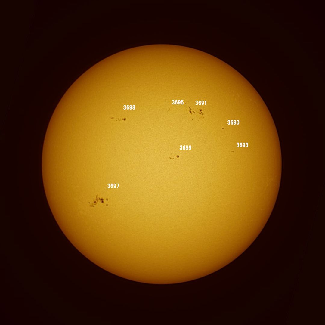 RAW/AVIファイルを本体から取り出して、ASIStudioで処理。アプリ内でそのままの色と太陽色を選択しコントラスト、明度を調整し画像1および画像2に示します。画像1の方には黒点番号を付け加えました。