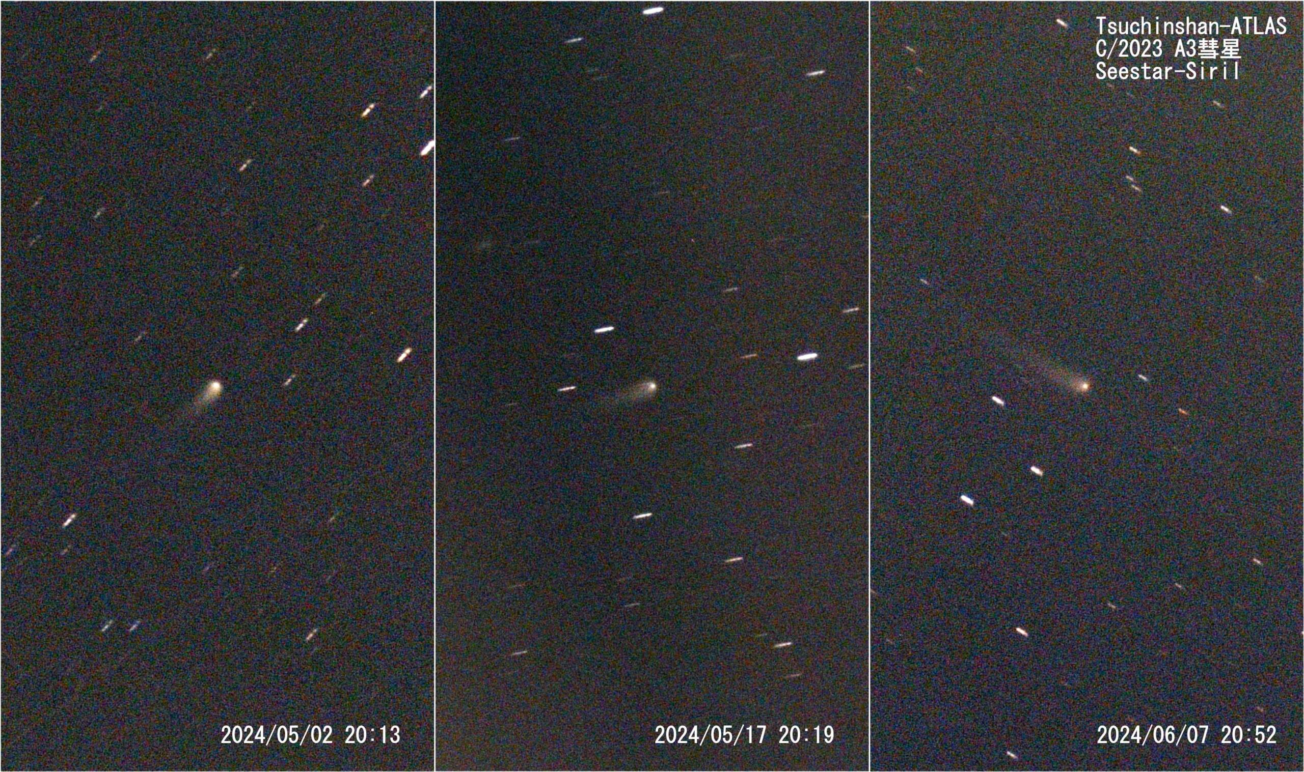 全てSirilにより彗星基準でDrizzle×2にしてスタック、そのままの画像(地平座標で上がその日時における天頂方向)から同一画角サイズにトリミングし、コントラストと明度のみ調整しています。