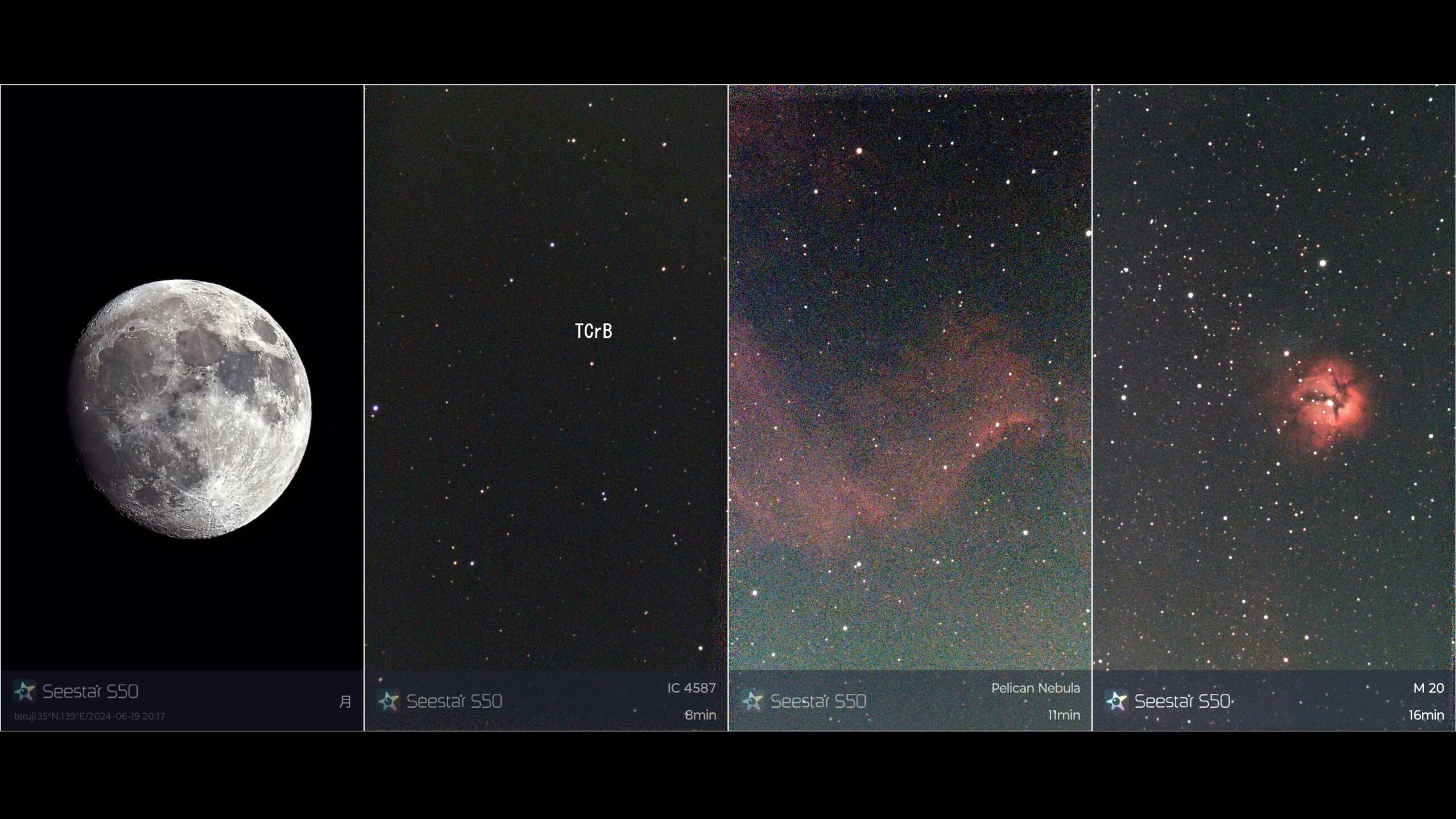 画像1 Seestarによる撮影例 2024/06/19 20:30~21:30 左から月、変光星、北アメリカ星雲の一部、M20三裂星雲 (星雲はDual-Bandフィルター使用)