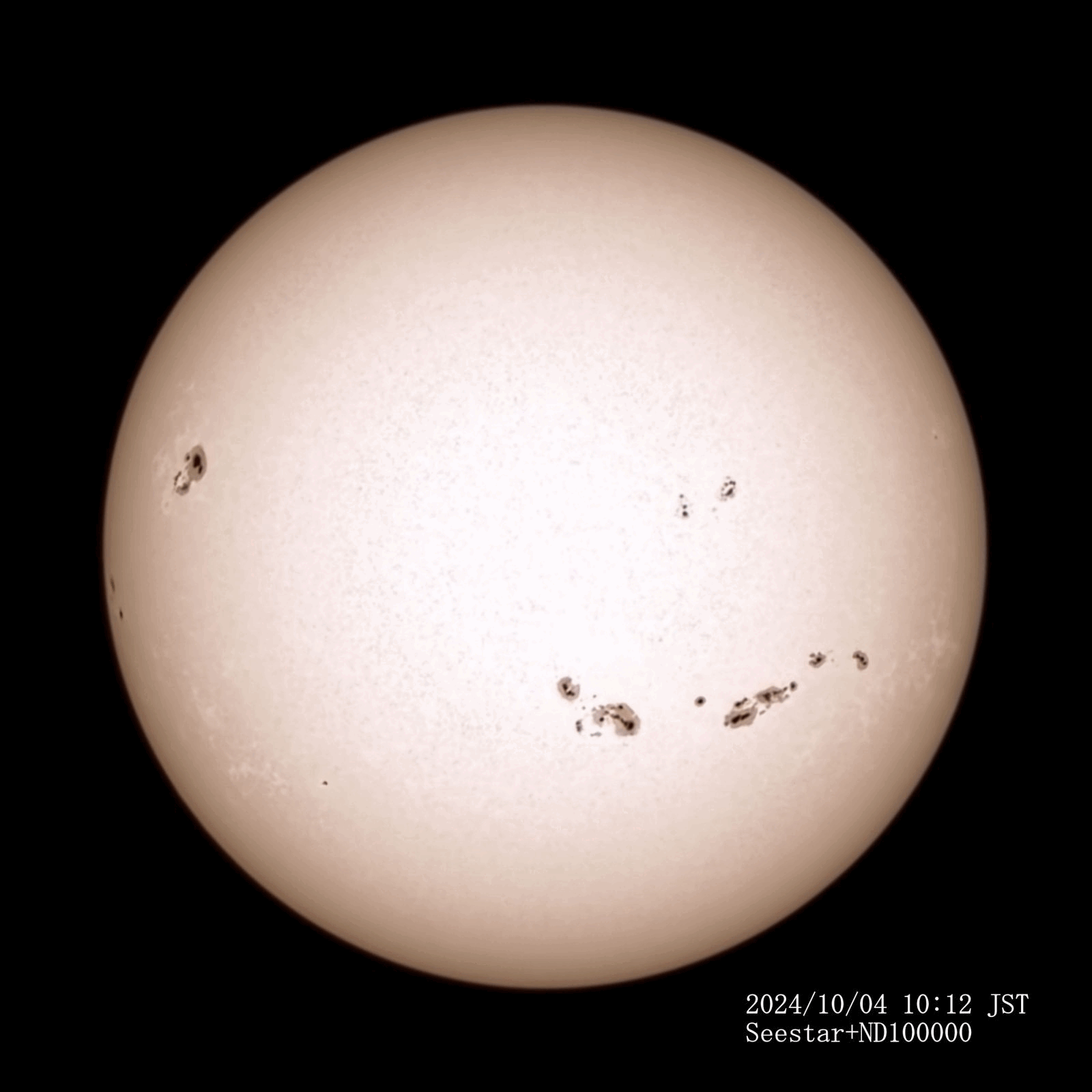 SOHOのC2/C3画像(2024/10/03~10/04 UT)およびSpaceweatherの10/03、10/04の記事では太陽表面で大きな爆発が発生したとのこと。その時の黒点でも見ておこうとSeestarで撮影。画像1に示します。