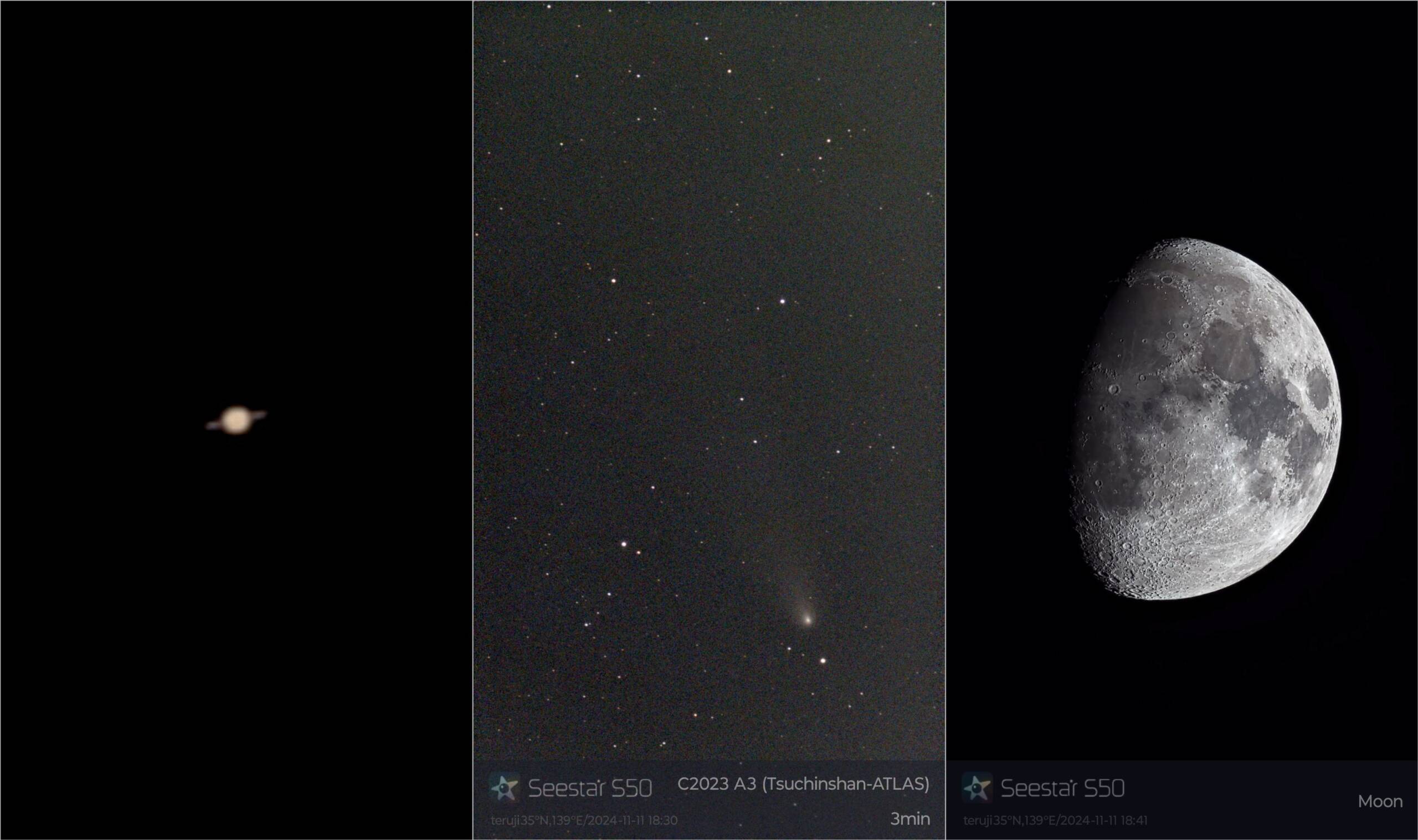 画像1 Seestar S50による三天体 土星、彗星C/2023 A3、月齢9.9 2024/11/11