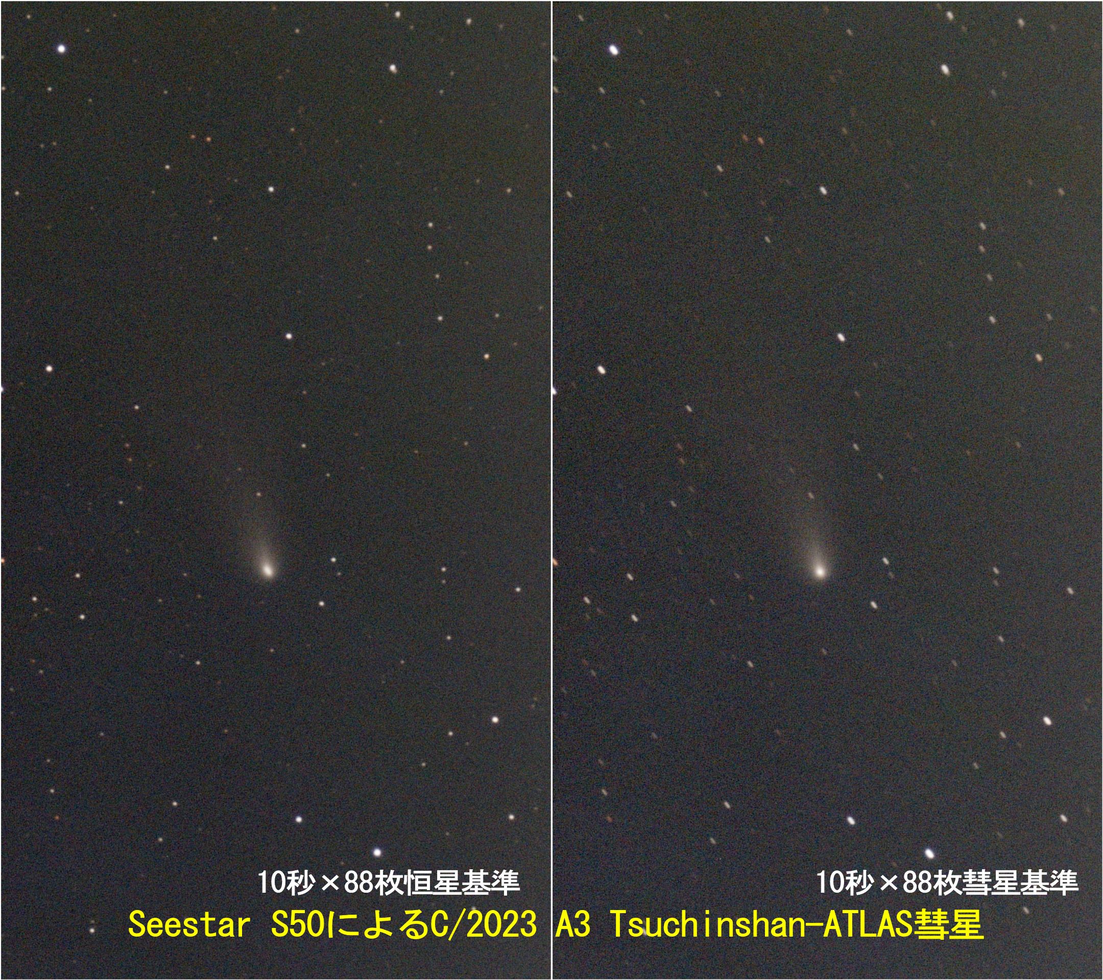 画像1に彗星を示します。10秒×88枚のFITS画像からSirilによるスタック画像で、左が恒星基準、右が彗星基準の処理です。撮影時間は15分、今までのように彗星基準にしても恒星が長く引く線はほぼ無くなりました。それだけ彗星の見かけの空の位置の変化が小さく今後は10分間のライブスタック撮影をしても違和感のない恒星、彗星の画像になるのでしょう。