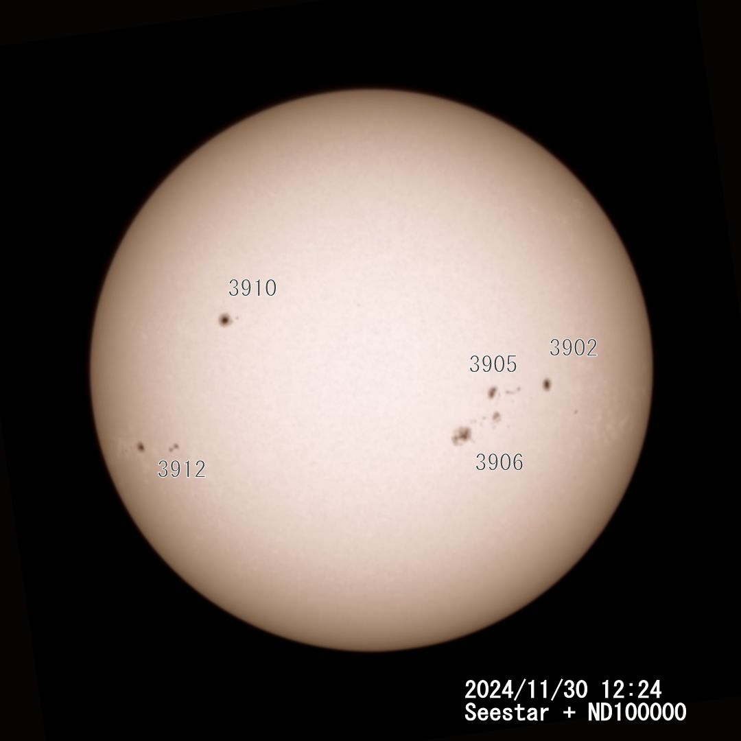 太陽の表面、黒点の出現はどうなんだろう、撮る前にSOHO等のページを見ましたら、スタンフォード大学が水害で関係サーバーのトラブルで太陽画像のサービスが滞っていることを知りました。他の観測所データによれば活発なのは変わらないようです。 画像1はSeestar S50にND-100,000フィルターを付けて撮影。画像1に太陽面を示します。記録メモです。 画像1 太陽 2024/11/30 12:24 Seestar S50にND-100,000フィルターを付けて撮影