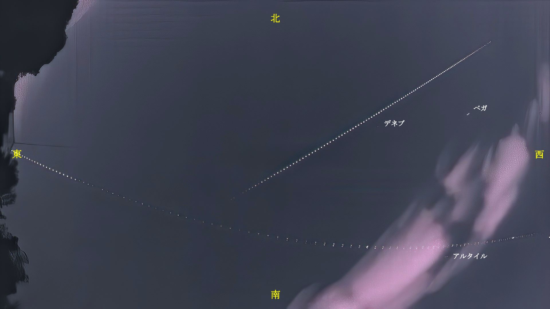真上に向けて広角で撮影していますので画像の東西はほぼ地平線近くになっています。恒星がもっと多く写ると思ったのですが外れてしまいました。普段は8秒~10秒露光のインターバル撮影なのでもう少し恒星が写るのですが今回は1/30秒露光の動画にしたため明るい恒星のみになってしまいました。ISSは北西から上昇し、中央の天頂通過後地球の影に入り消えました。