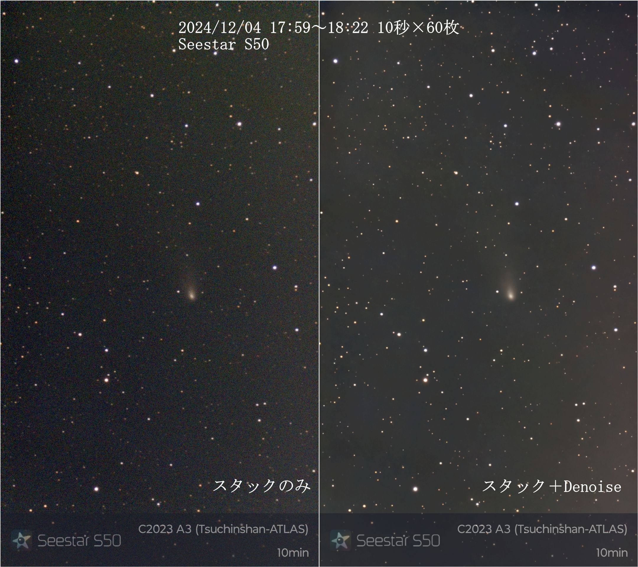画像1 Seestar S50による彗星C/2023 A3のスタック画像およびスタック+ノイズ除去画像の比較
