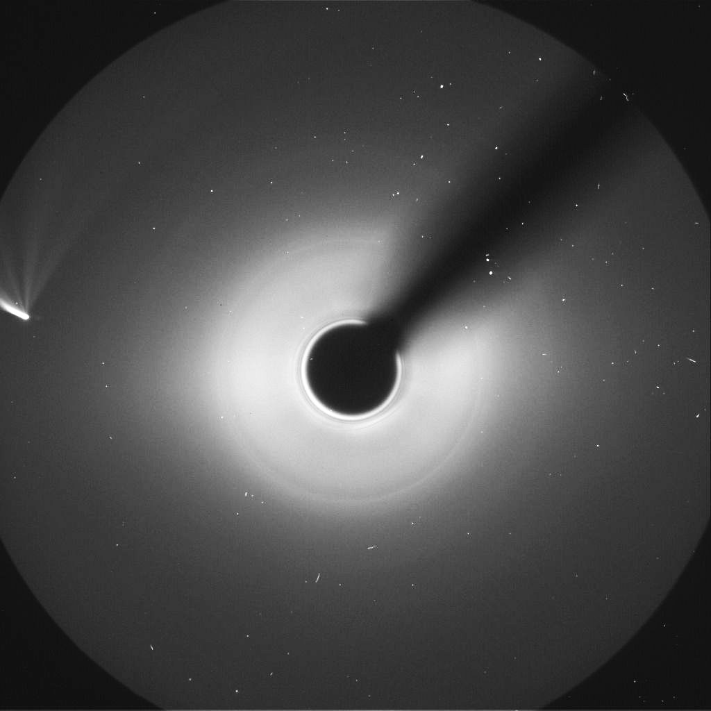 結果を画像1に示します。尾が薄く、彗星らしく写っています。画像2には撮影時刻よりも3時間ほど前のSOHO C3画像(撮影時刻ではほぼC3画像の端の画角位置にっなてしまったので)を示します。それと比べると迫力に欠けますが昼間でカメラのみで撮れたことに満足です。