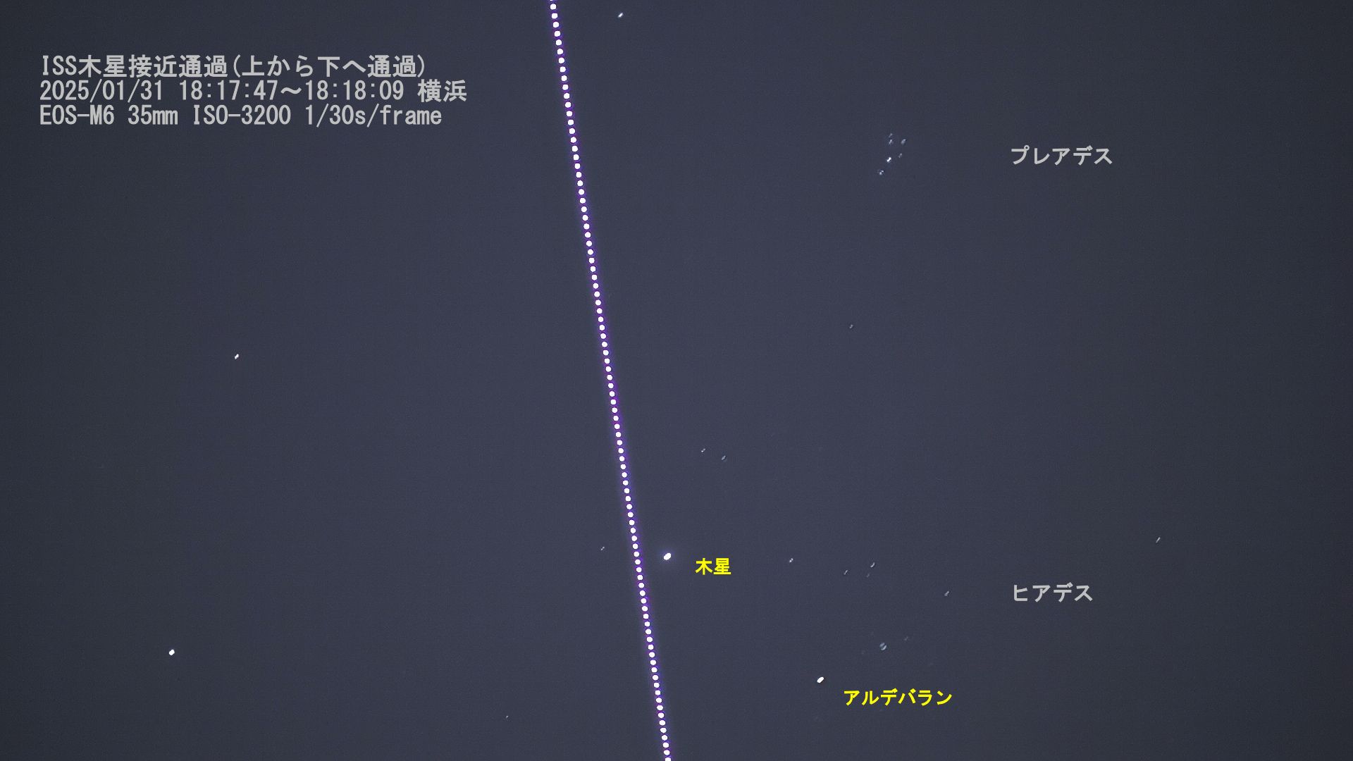 画像1 ISSの木星接近通過 2025/01/31 EOS-M6 ISO-3200 F1.4 35mm 1/30s/frameマニュアル2Kから