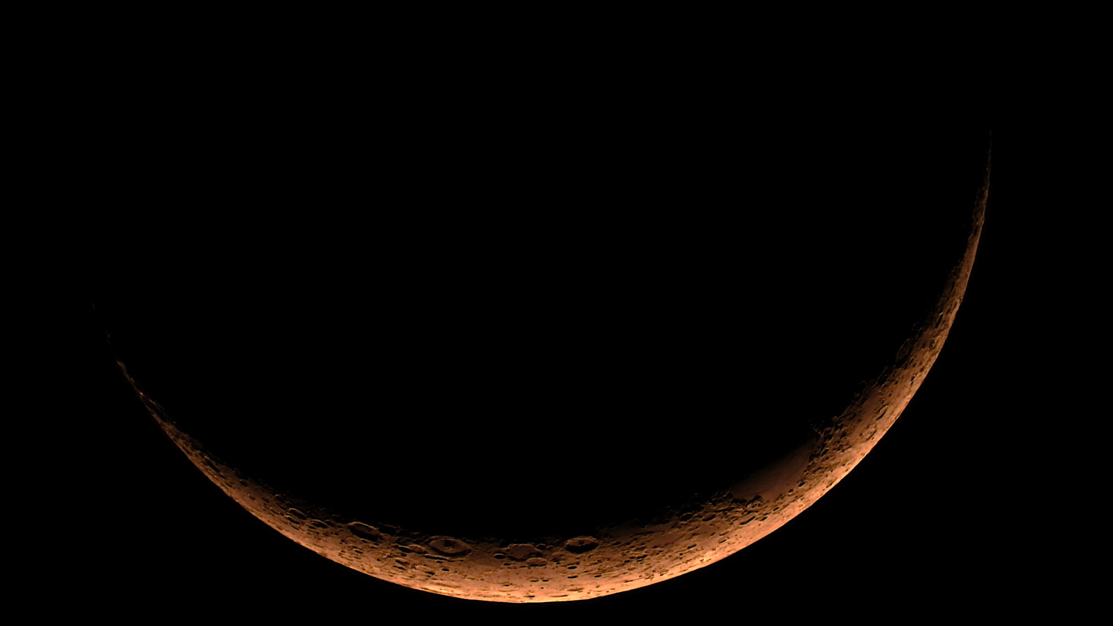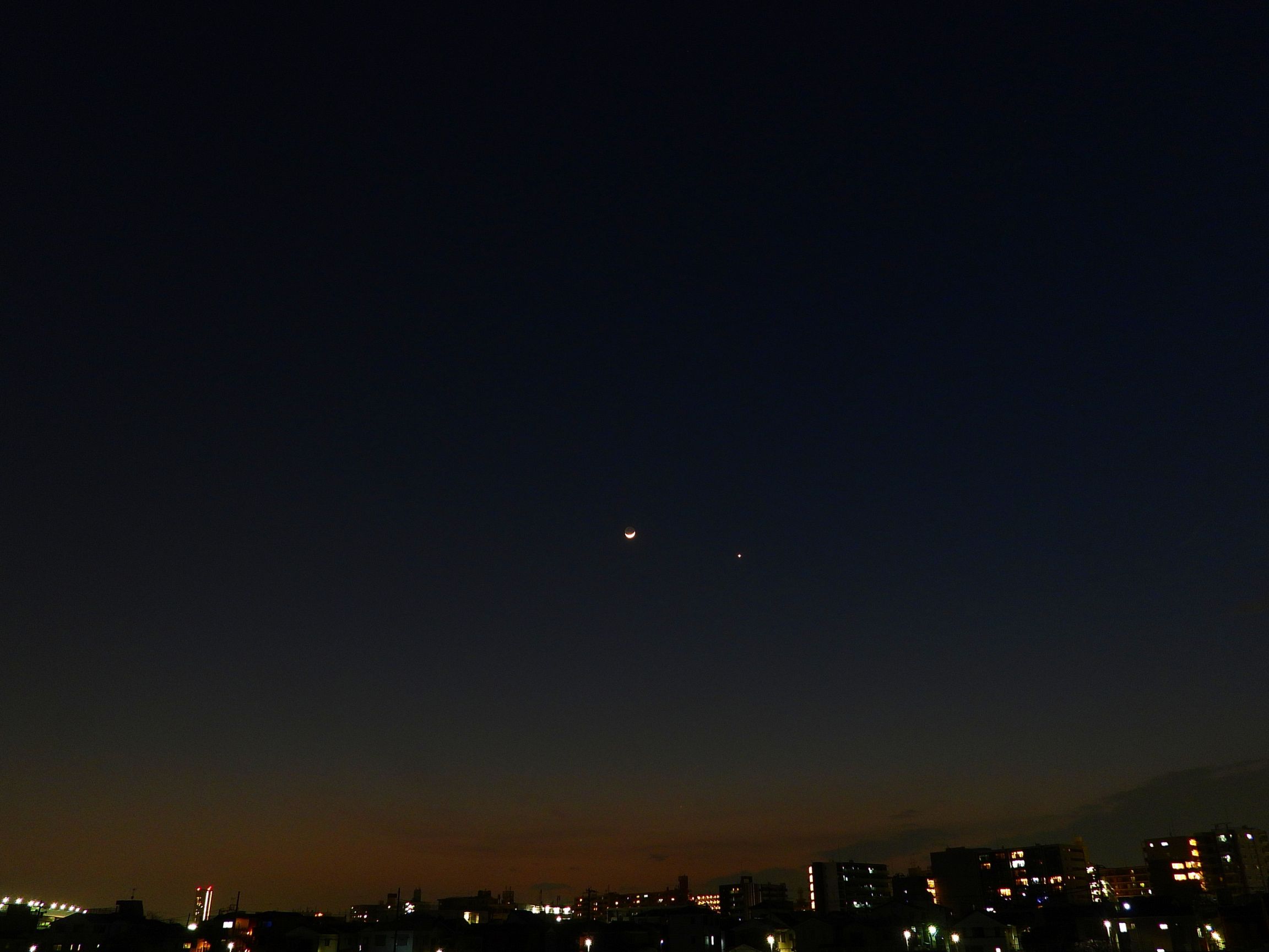 既に太陽は地面の下に沈み、月および金星はその方向からの太陽の光を受けて地上側に明るい面を向けています。黄道との位置関係から金星がほぼ地上側に真下に向いた面が明るく、月はやや右下から太陽の光を受けるように見えています。同じように細くどちらも地上側に向けた様子が面白い。