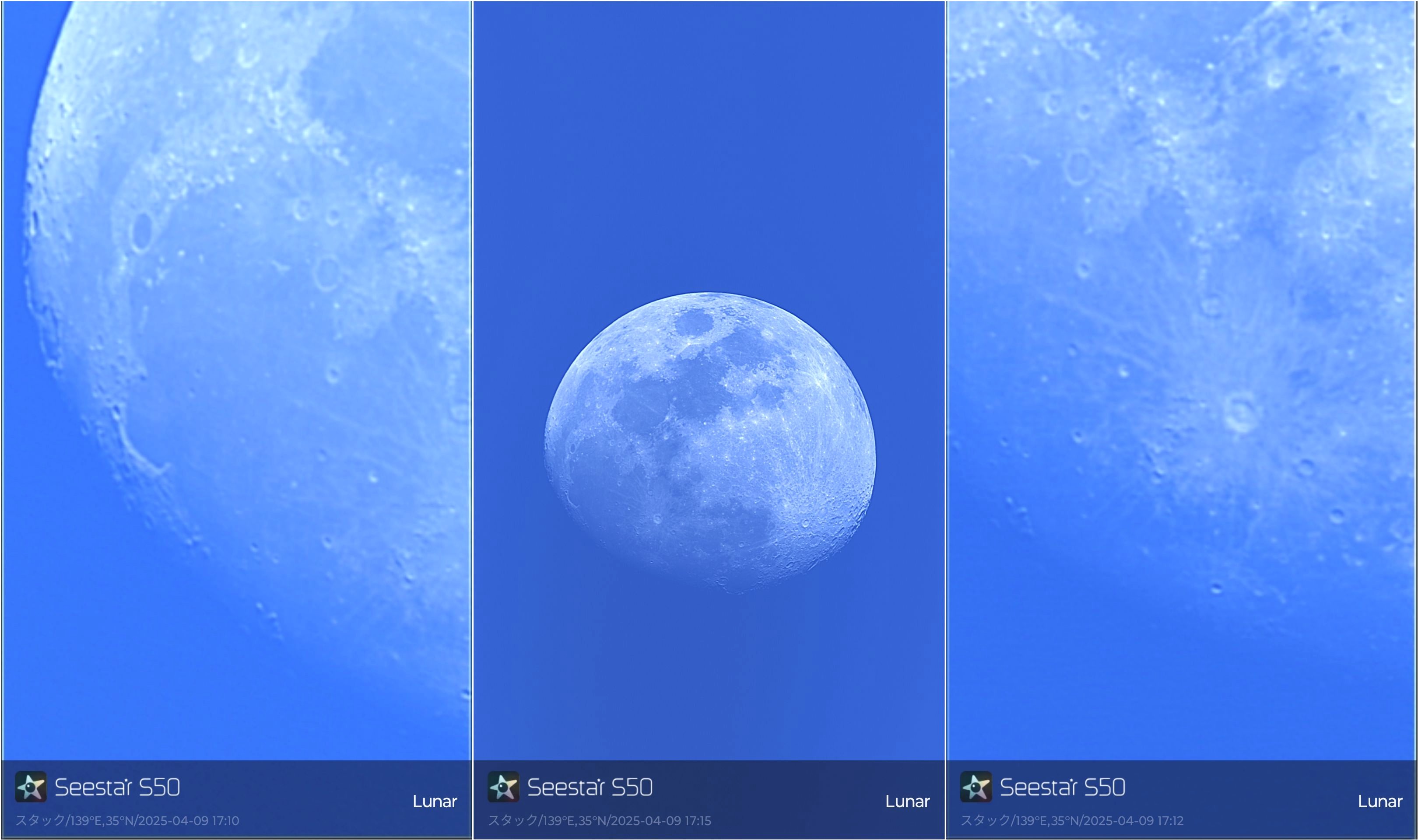 晴れて空を見ると青い空に白い月、美しい。暗い空を待たずに思わず窓のそばにSeestar S50を置く。コントラストのあまりない月を単純に眺めながらの撮影も良い。RAWビデオをアプリ内でスタック、その画像をWiFiで取得。画像1に示します。左から雨の海/虹の入江/プラトー、中央は月齢10.9フル画像、右にコペルニクス。記憶ではもっと明るい空の印象。 画像1 月齢10.9 Seestar S50による