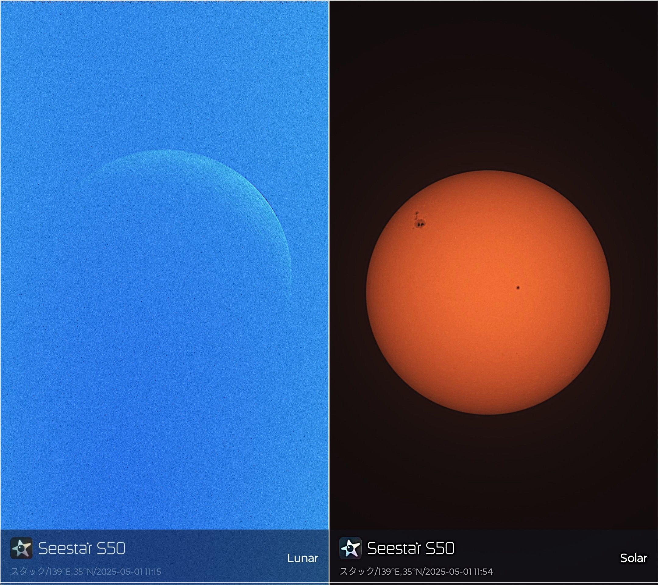 画像1 月齢3.3および太陽 Seestar S50のRAW AVIファイルをアプリ内スタック処理 2025/05/01 11:15および11:54