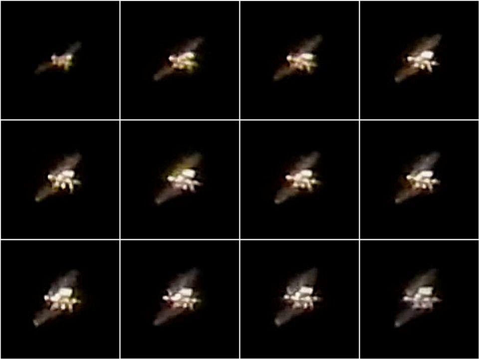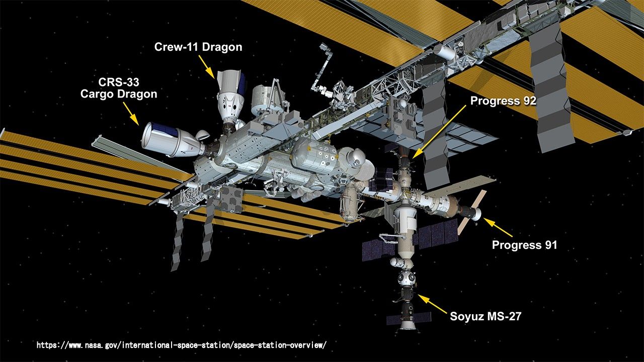 画像1に動画から比較的画像の良いフレームを取出し整理したものです。南空から見え始め、昇りつめて東に向かう途中で消えました。画像2に参考に当日のISS構成を示します。画像1の解像度はそれなりでボケているように見えていますがそれでも今回は陽のあたりが良くて、ソーラーパネル、ラジエーターはもちろんドラゴン、ソユーズ辺りも見えて面白い。進行方向は左で先頭の白い点状に見えているのは貨物用ドラゴン、油井宇宙飛行士が搭乗してきたクルー11ドラゴンは地球と反対の宇宙側にドッキングしていますので見えづらい。ちょうど斜め下からISSの底(地球側の面)を見ている感じです。