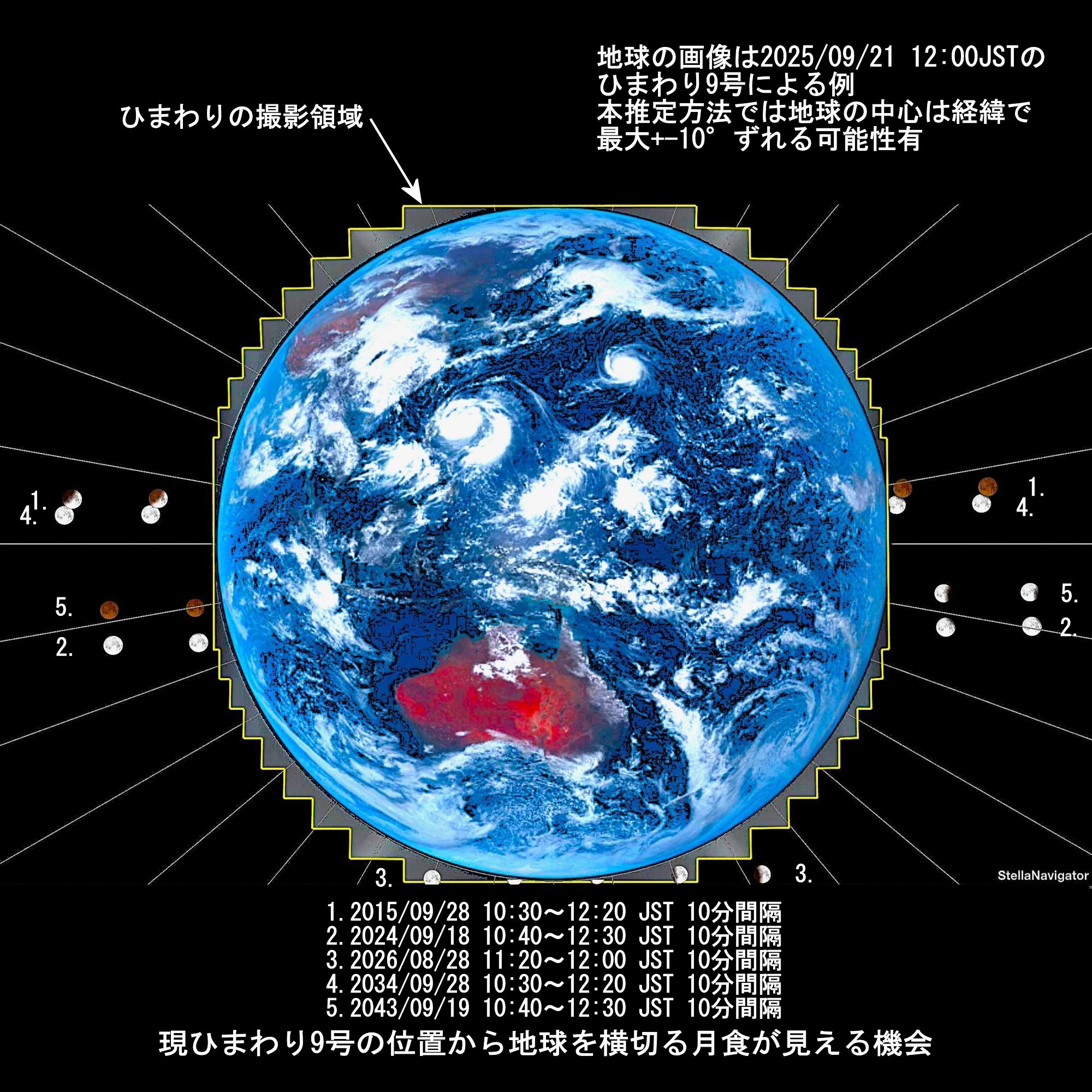 前提は今のひまわり9号(8号も含みます)の定時撮影方式が続けられた場合、今後の月食が写る機会がいつ訪れるのだろうか、方法は前記No.1512の記事中のとおりステラナビゲータ利用によるものです。この方法による今までの画像確認実績から予測精度として、時間のずれは+-10分以内(画像1枚か2枚のずれ)、位置のずれは最大で緯度経度で+-10°と考えられます。ピタリの予想方法ではありませんがその時間帯、位置でほとんど百%近く見つけ出せていることには違いはありません(写っているはずと思っているので写っていない場合の確認の方が時間を要し大変です。月の場合は容易です)。