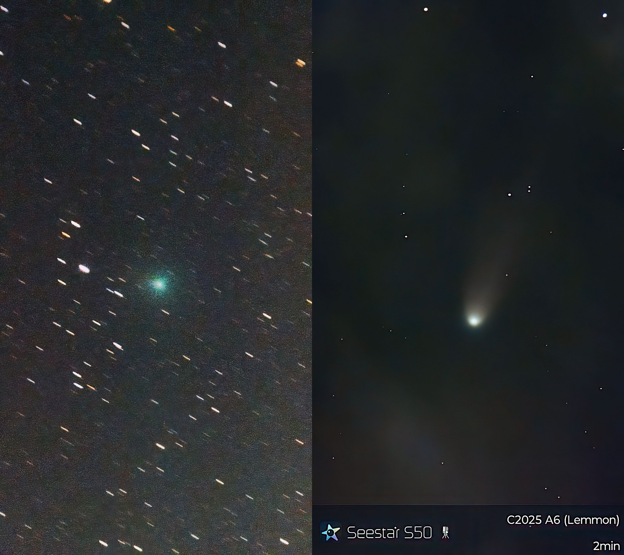 右のLemmon彗星の画像は雲が多く写ってしまっているものを除いて7枚の画像(18:33~18:35)をSeestar本体内部のアプリでスタック。2分間に撮られた画像なので彗星の像もそれらしく見えています。