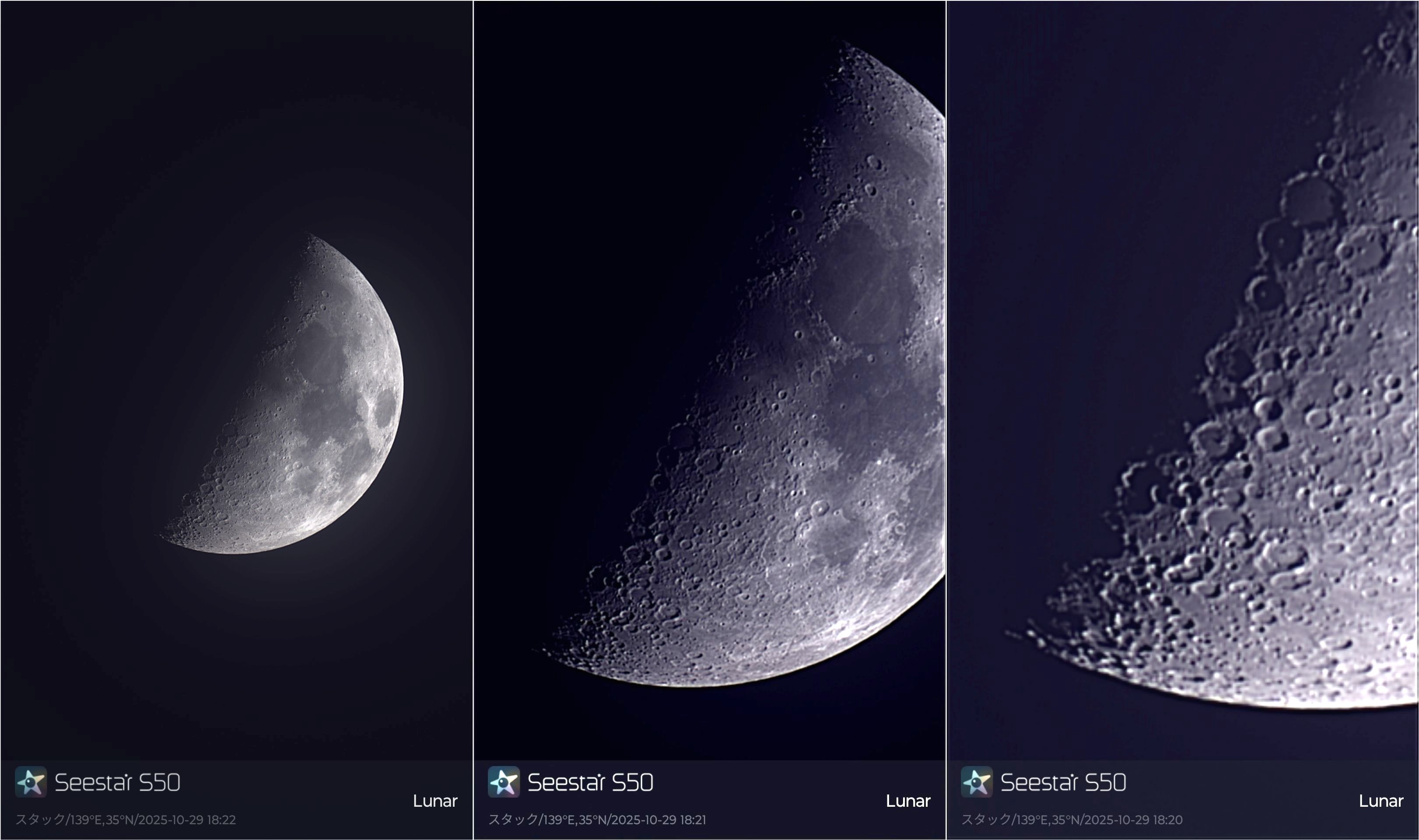 画像1 月齢7.9 2025/10/29 18:20~18:22 Seestar S50 左からSeestar倍率×1、×2、×4で撮影