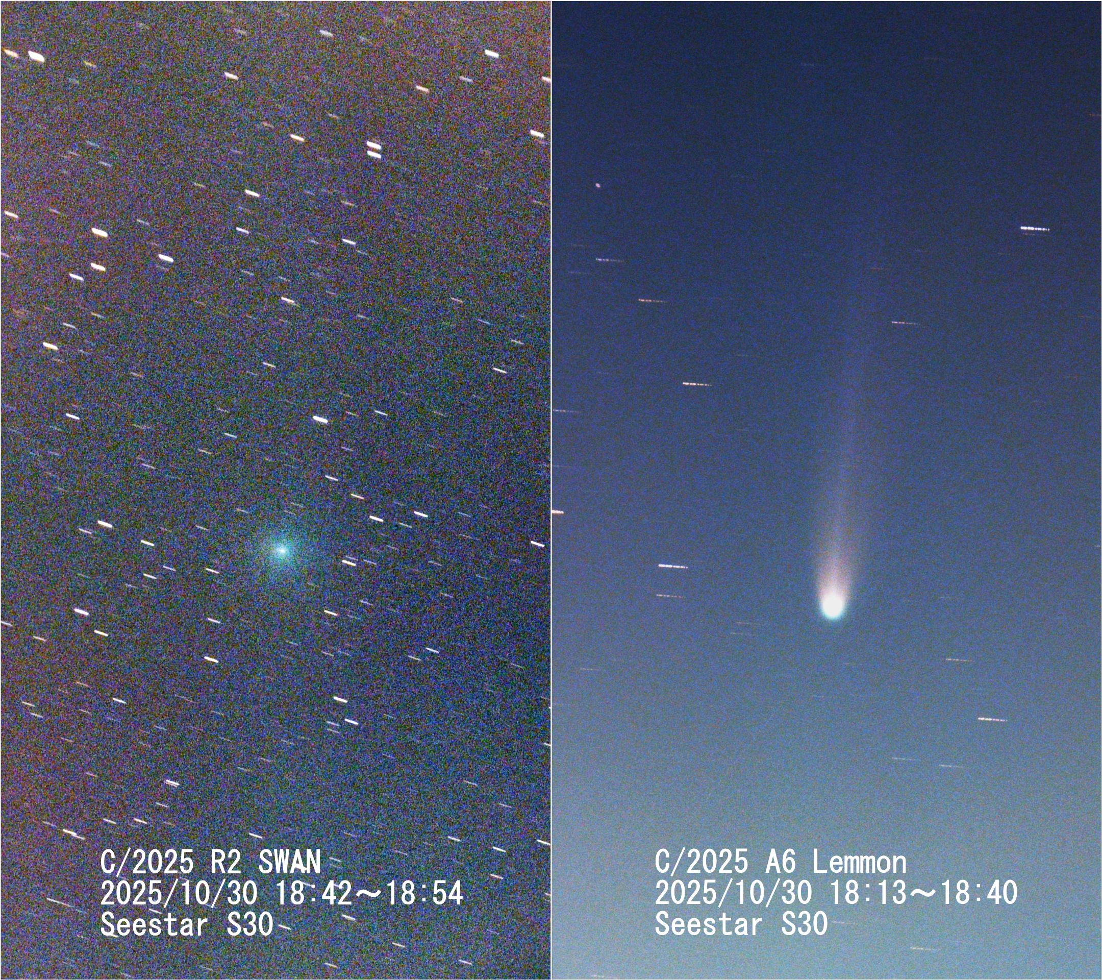 やっと、昨日、西の低い空に雲がない天気に恵まれました。Seestar S50およびS30を彗星に向け、特にレモン彗星は期待した通りクッキリした姿を見せてくれました。レモン彗星の撮影後、南の空に向けてスワン彗星も撮影。