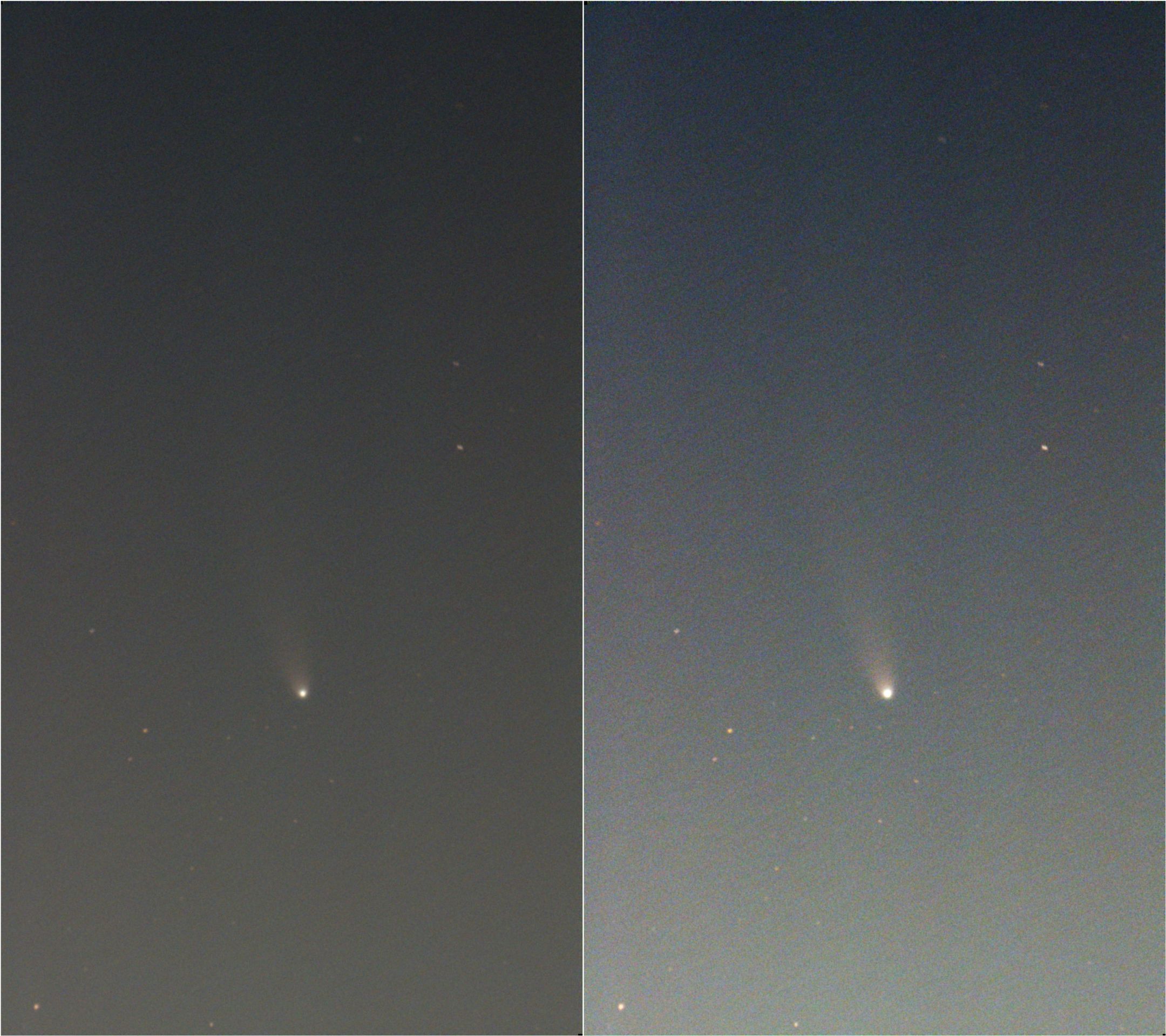 画像1 レモン彗星 C/2025 A6 Lemmon 2025/11/07 18:06~18:11 Seestar S30(左が26枚によるスタック画像、右が明るさ等補正画像)