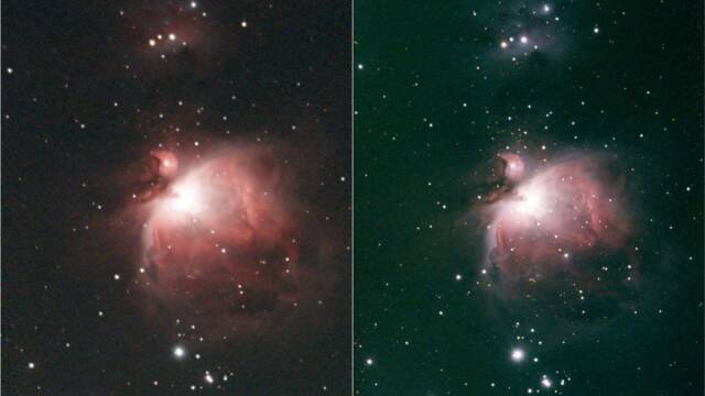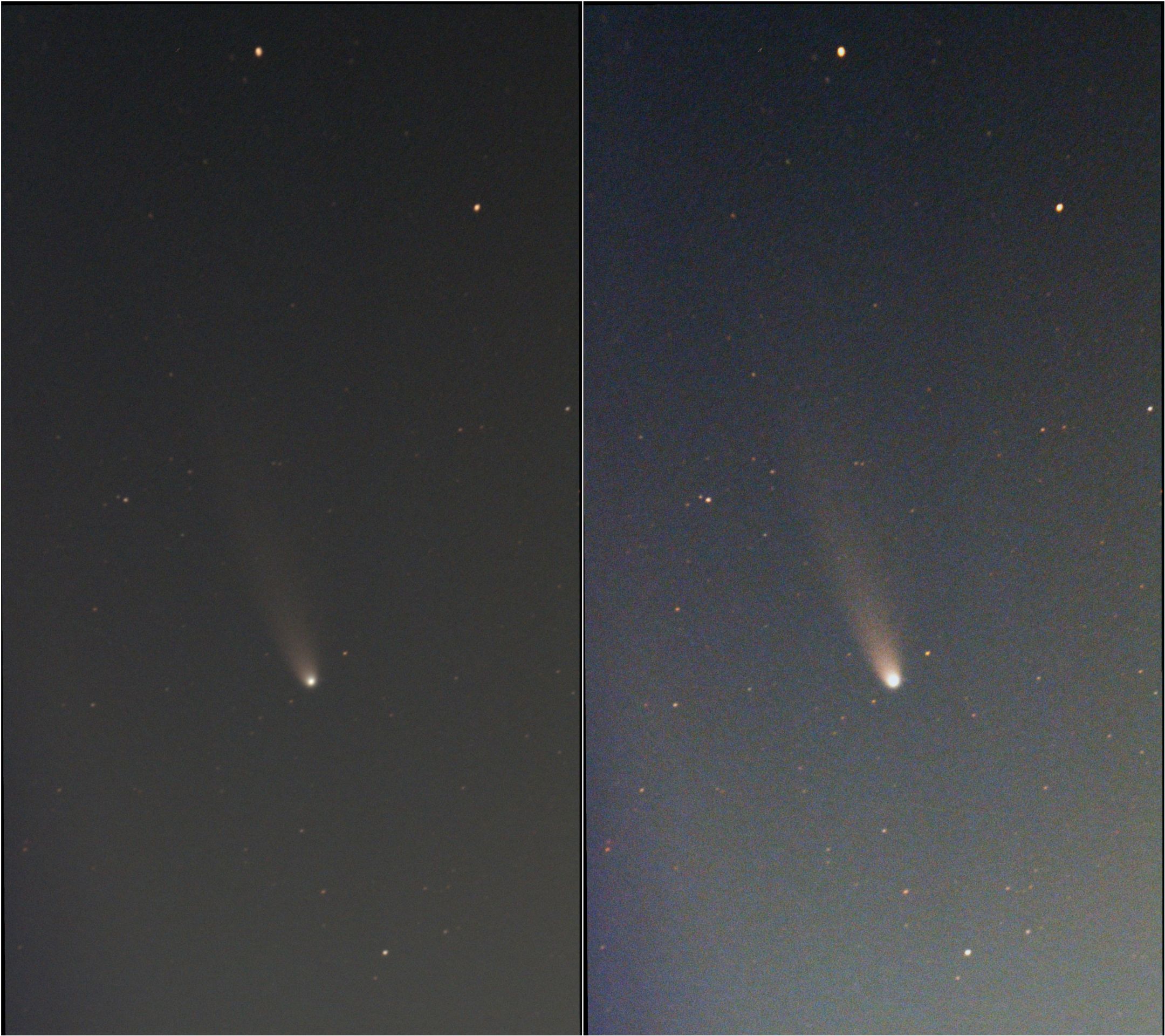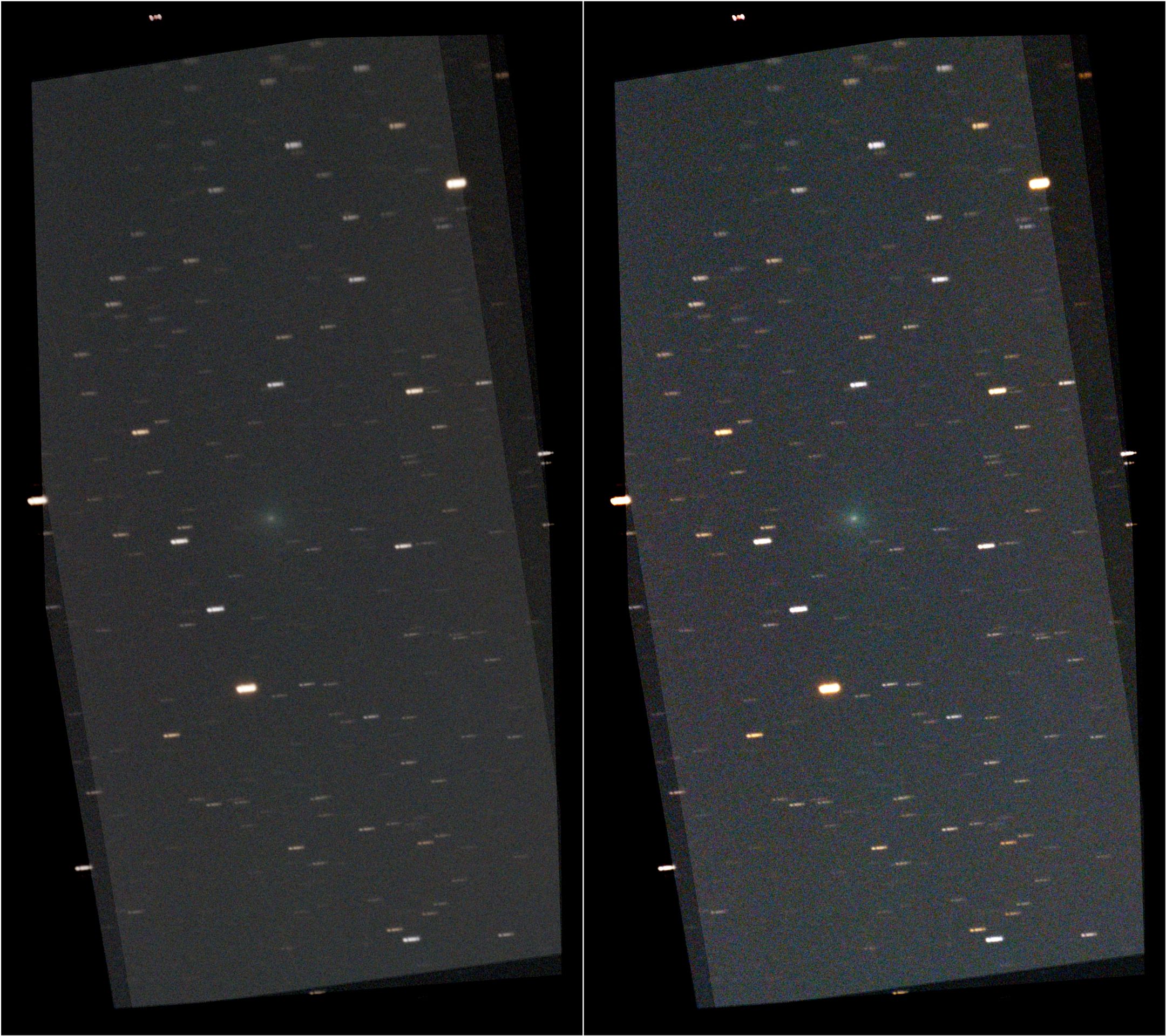 90枚以上の画像が記録されましたが、最初の17:57~18:02に撮られた24枚を用いてSirilでスタック。彗星位置基準で処理しています。結果としてスタックに使用されたのはブレ等を除いた20枚。その結果を画像1に示します。左がスタック後、そのままの画像、右は明度等、彗星が浮かぶように調整した画像です。