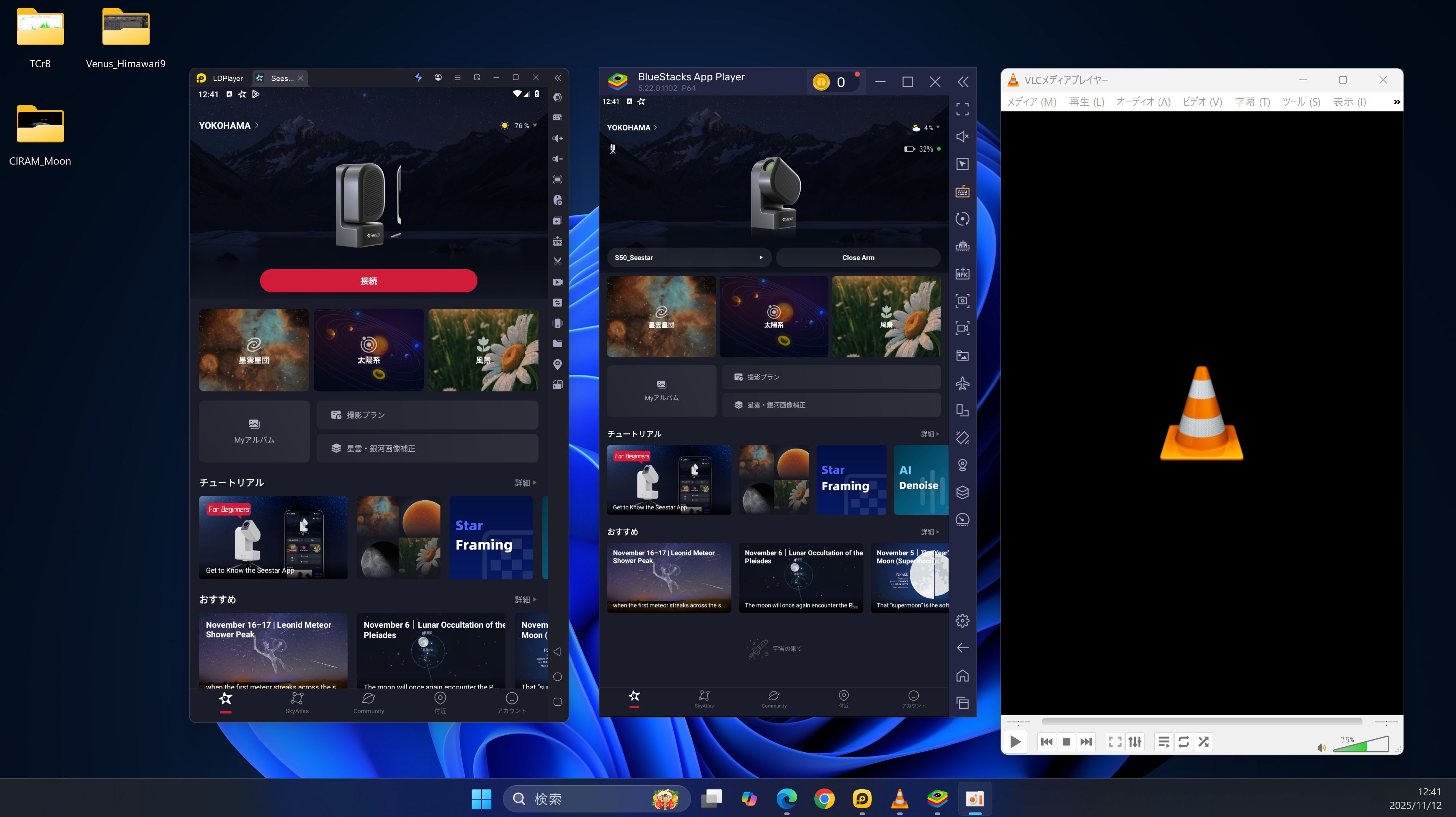 画像2はWindows画面でエミュレーターBlueStacksでSeestar S50がつながっていることを示すものです。左のLDPlayerは立ち上げたままの状態を示しています(つながらなかったのでそのまま)。右のVLC media playerはRTSPアドレス接続で両アプリの画面で天体が表示されるかどうか確認しようとしたものです。
