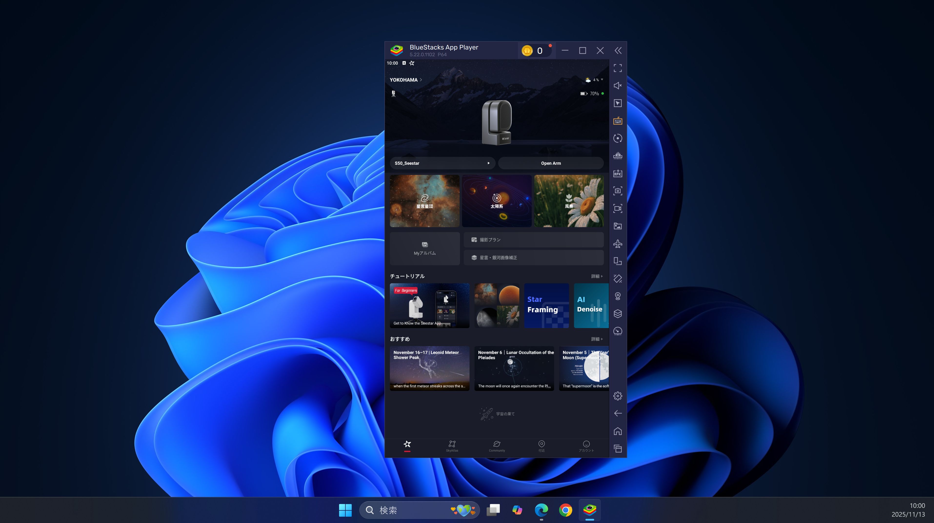 そのようなあいまいな段階なのですがWindows11でエミュレーターBlueStacksでSeestar S50の操作が成功した例には違いがありません、接続の流れを今後のために記しておきます。