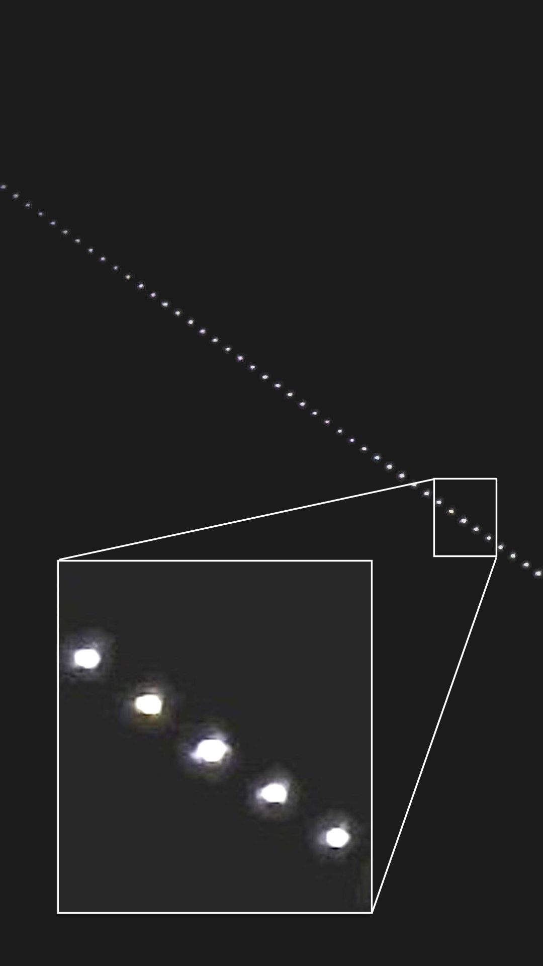 撮影結果を以下に示します。画角内通過時刻はステラナビゲータとピタリ一致し、現地では2025/11/12 17:41:16でした。動画1は設定した空の位置の画角内を通過するISSです。45コマにISSが写っていましたので1.5秒間で画角内を通過しています。焦点距離が1,750mm相当で撮影したことになります。この動画から比較明処理した画像およびその部分拡大画像を画像1にまとめて示します。拡大撮影とは言えない写りですが、光る点の周りは何となく太陽電池パネルの存在を連想させるものです。天頂に近い通過があれば面白そう。