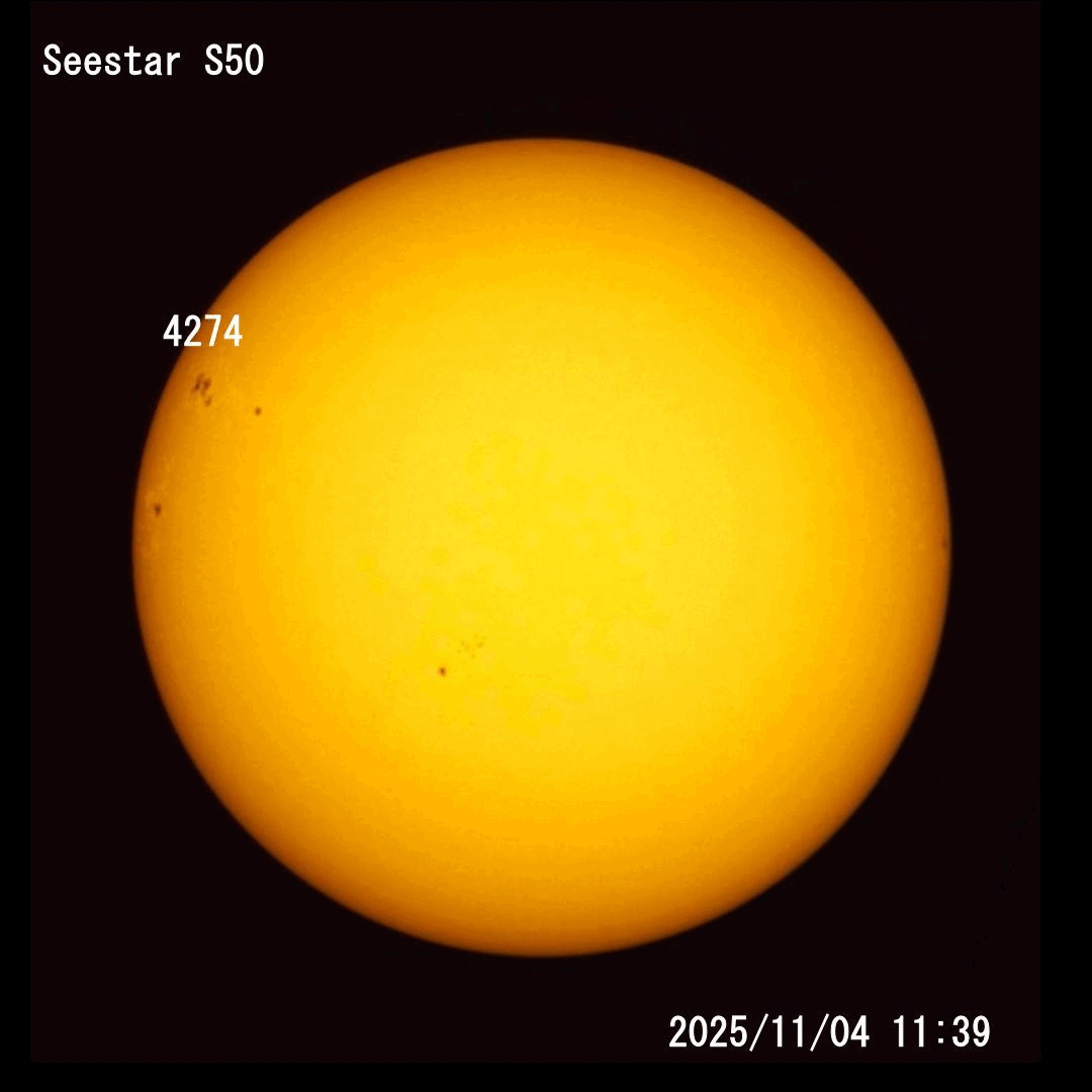 今月は11/04~11/14の間にほぼ三日間隔で4回太陽面をSeestar S50で撮影しました。そんなに黒点が多いと感じませんでしたが、最初の11/04にはその中でも大きめの黒点4274が東側の端に見え始め、11/14にはそのまま自転により西側の端に移動する様子が見えました。太陽白色光の画像では活発な様子はわかりませんが、専用の太陽望遠鏡やSOHO等の公開観測データでは活発な様子が報告され、特に2025/11/11 19:00JST頃には黒点4274の領域で爆発(フレア)が発生し、しかもその時にちょうど地球方向に向けた面で発生したので吹き飛ばされたコロナが地球へ影響したとNICT等から報告されています。