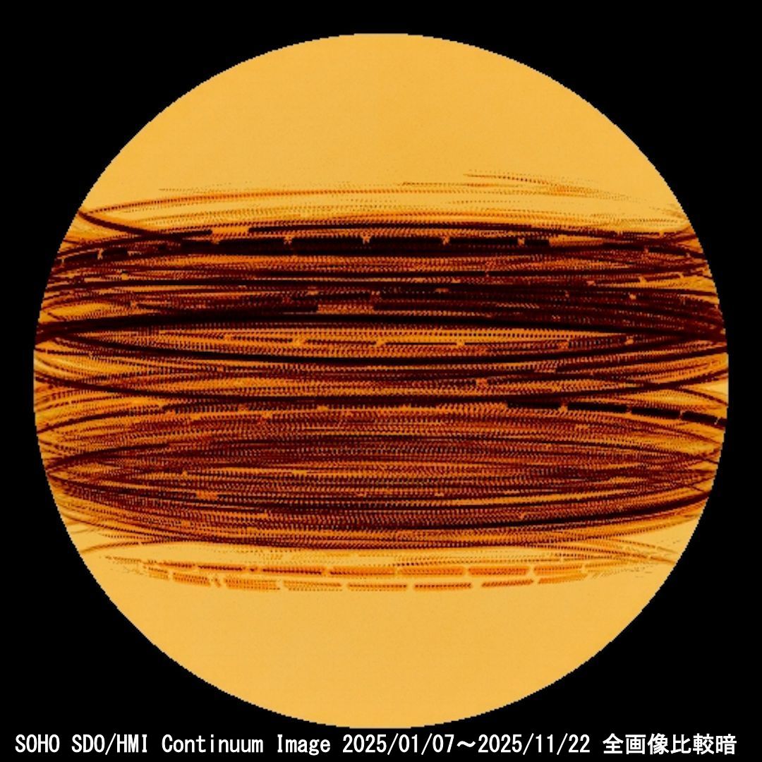 画像3 太陽黒点の2025年の一年間(2025/01/07~2025/11/22時点まで)の全軌跡 比較暗処理で表示