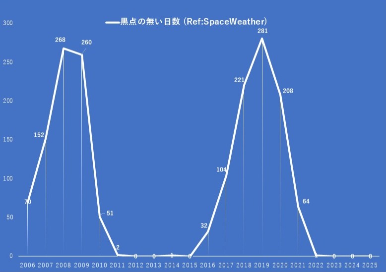 白色光画像しか見ていない一般者(道具はないが、無くても毎日多数の公開データでプロミネンス、フレア等は見られていますので活発な活動の状況は認識できます。毎日のTVで見る天気予報みたいな感覚でしょうか)として、今が活発な太陽活動期(極大期)に入っていると知り得ていたとはいえ、年間で太陽黒点の無い日がゼロは無いだろうと思っていたら、SpaceWeatherのトップページにある毎日太陽の欄に2006年~2025年の黒点の無い年間の日数が記載されていました。
