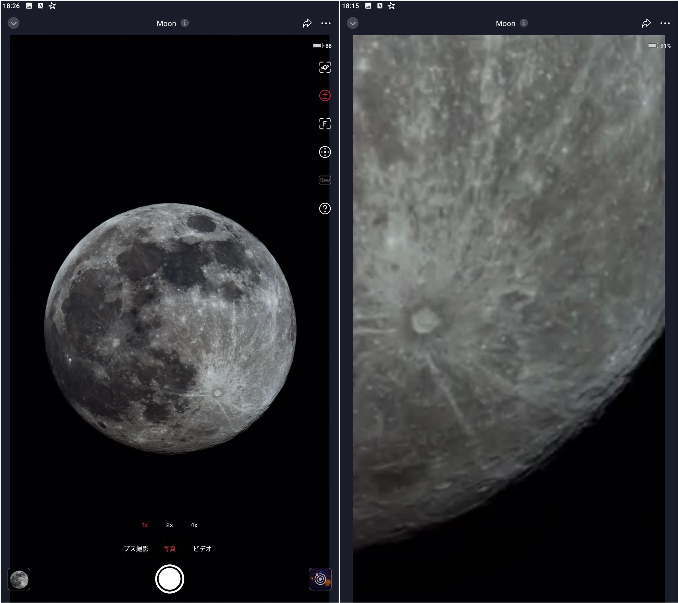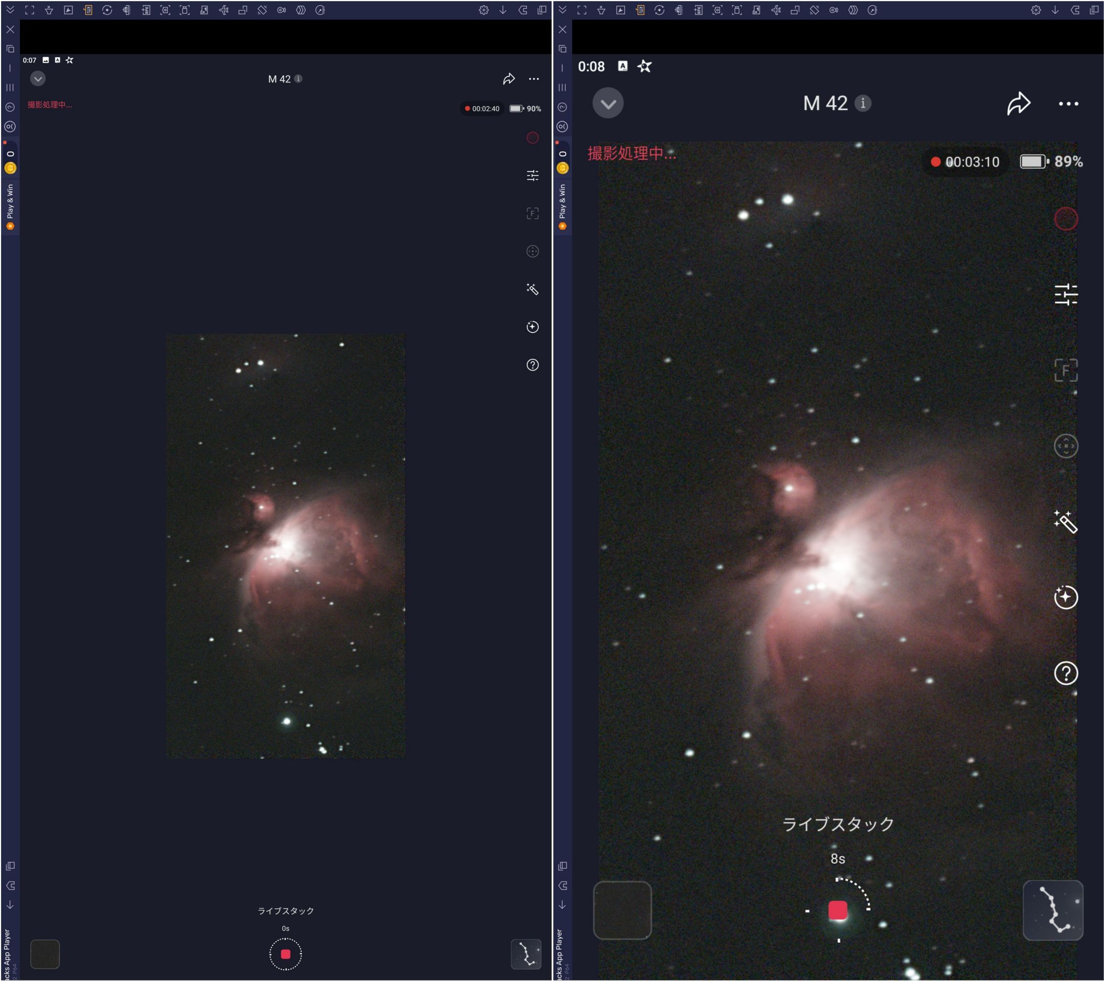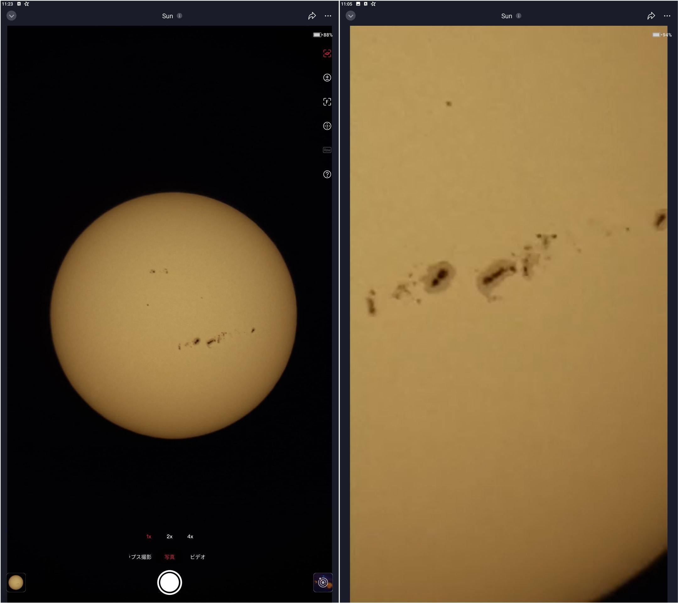 M42、月および太陽の例を順に示します。月および太陽の画像では左が標準、右がマウスで拡大した画像、M42の場合は左が標準、右がSeestar側で4Kモードを選択し画面いっぱいに表示したものです。