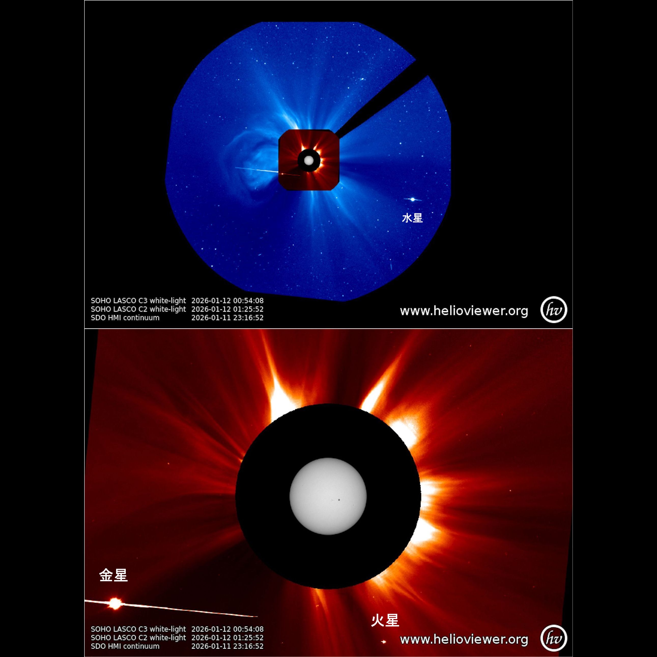 画像1 太陽、金星および火星のSOHO、SDOによる画像 2026/01/12 Helioviewerによる