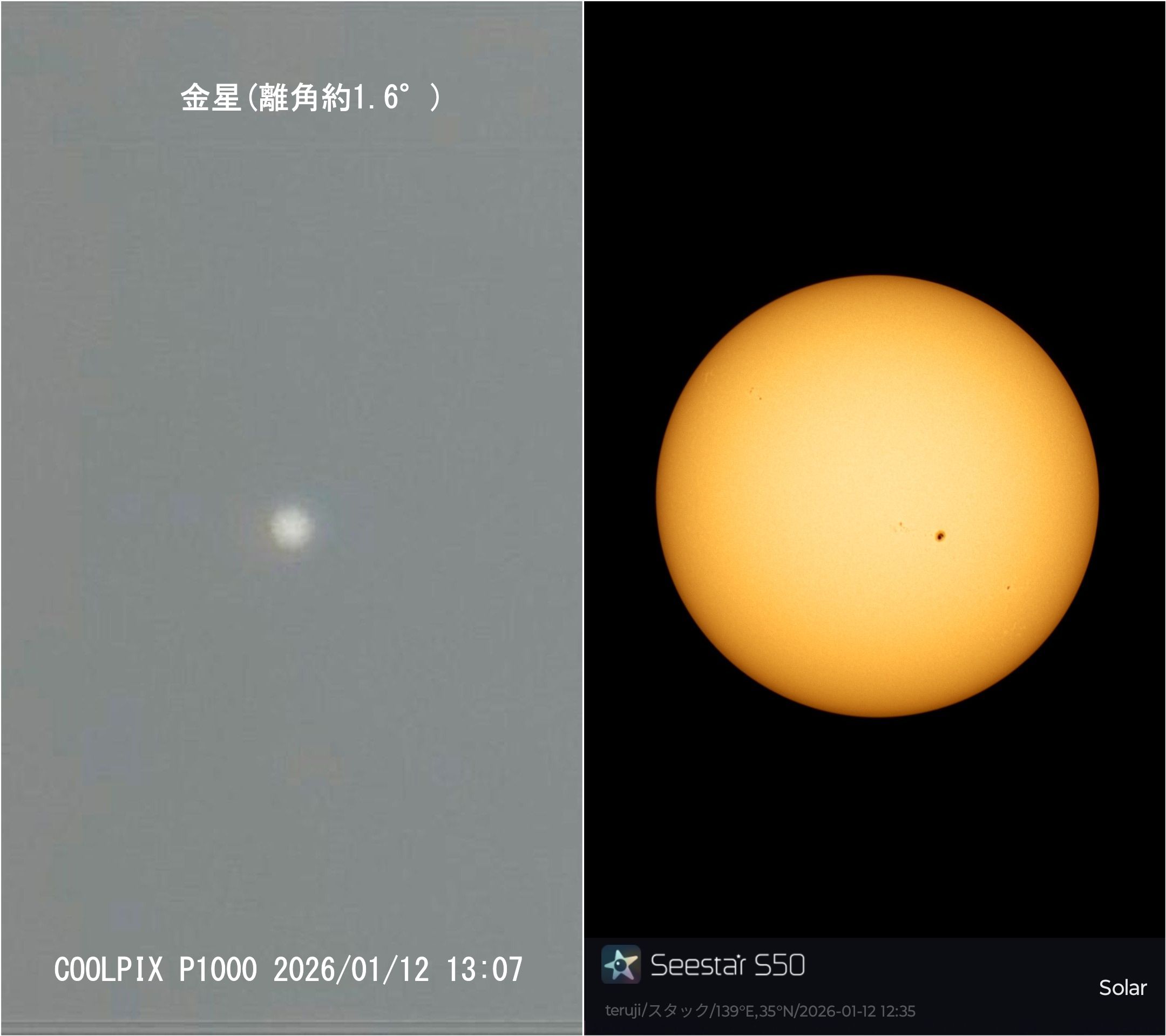 画像2 太陽と金星の実写 2026/01/12 お昼頃