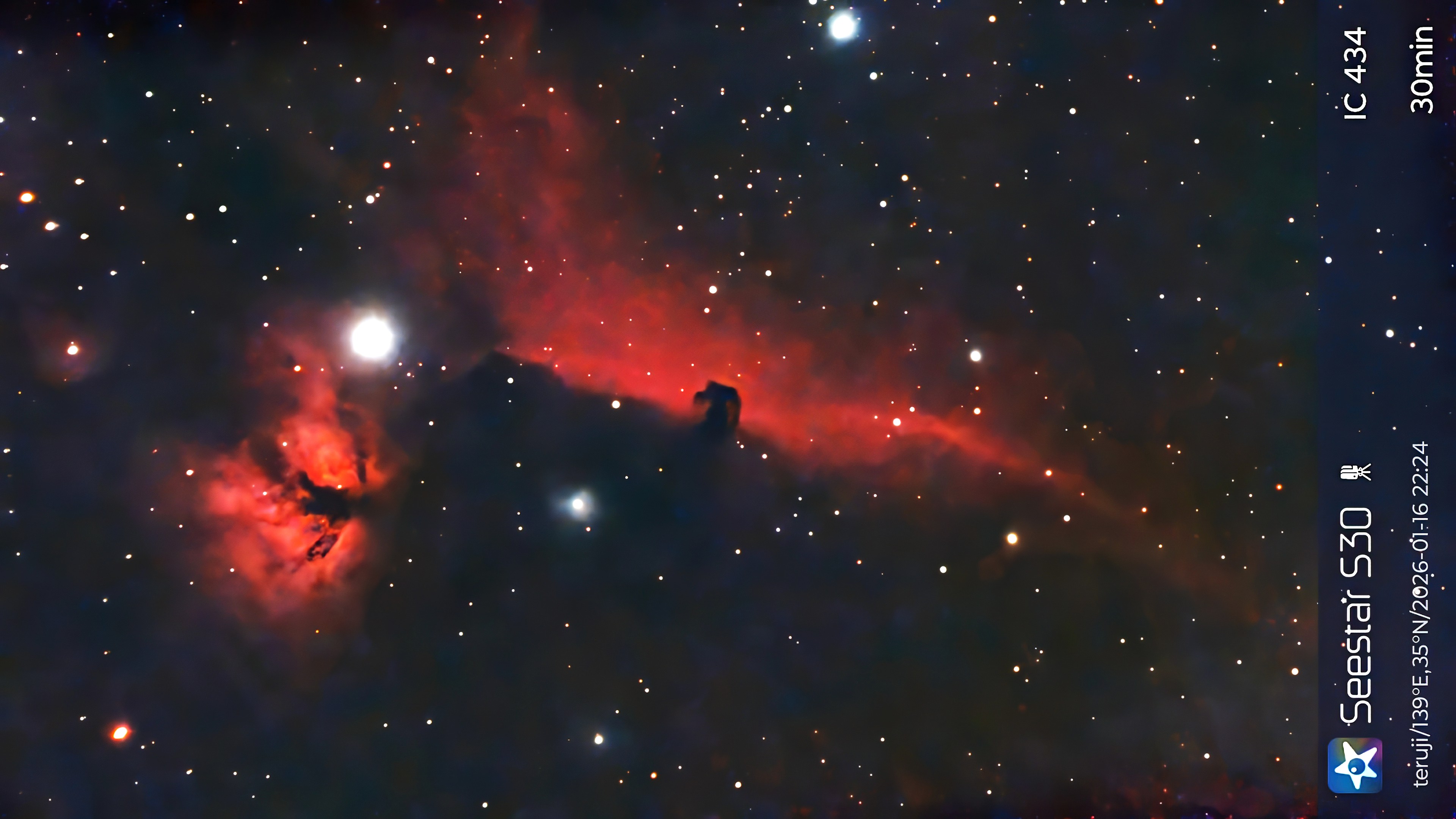 今年最初の馬頭星雲(7.3等)、燃える木星雲(8.0等)の撮影。Seestar S30によります、2026/01/16 21:48~22:25。