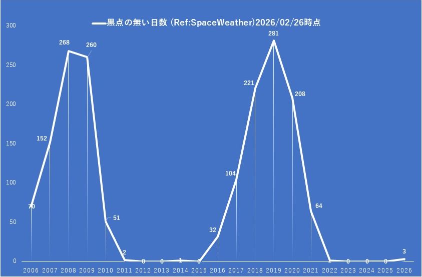 以前に黒点の無い日の年間日数をグラフ化しましたが、2026年はまだ2月ですが0でなくなりましたので改めてプロットしました。それを画像3に示します。