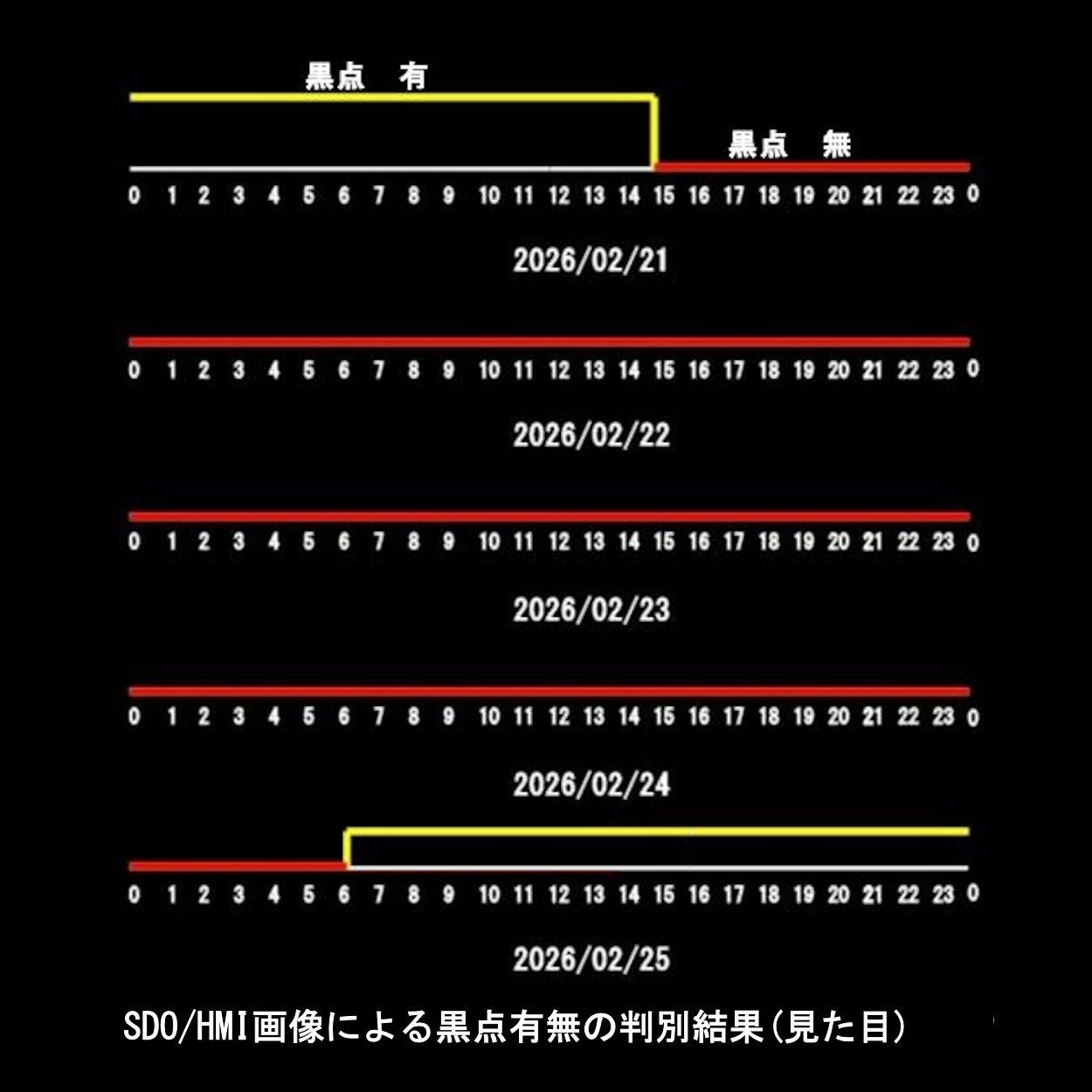 画像2に2026/02/21~2026/02/25までのSDO/HMI画像で見た太陽黒点の有無(数は関係なし)の結果を示します。2/21は西端(画像右)に”4374″が太陽の裏側に回り込み見えなくなったのが15:00、その後、黒点無しの時間帯を経過し、2/25の東端(左)に”4378″、”4379″(かなり小さいが拡大すると黒点が見える)が現れたのが06:00。時間の流れに対し黒点が見えた場合は黄色、無かった場合は赤で表示。