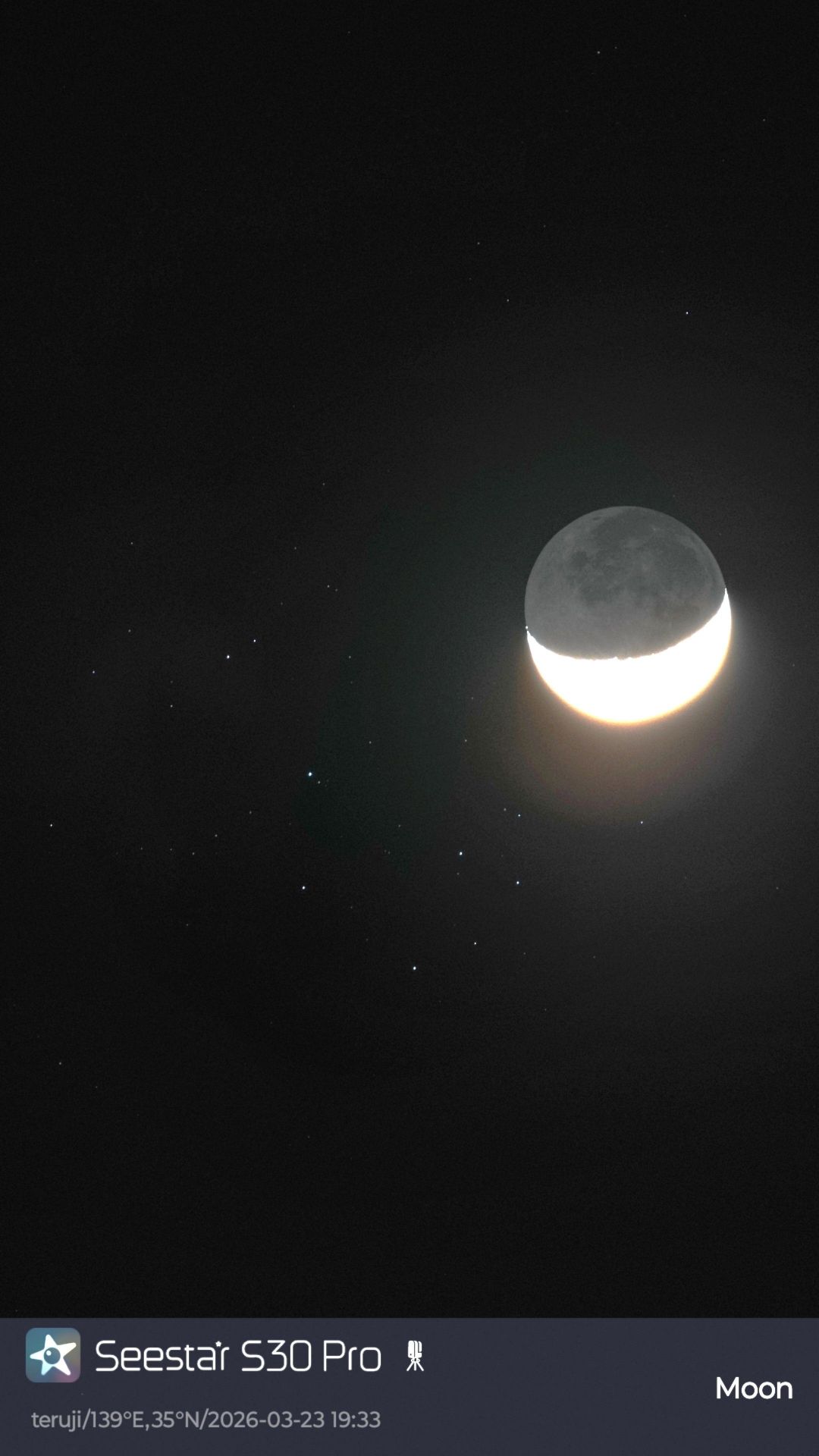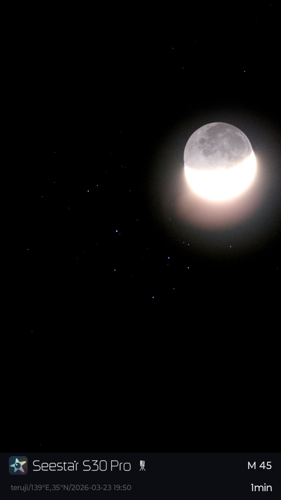 今回のチャンスは観測時間帯が宵で、かつ細い月(月齢4.4)と恵まれましたので期待しながらSeestar S30Proを持ち出し撮影を楽しみました。最初の月自動導入モードではM45は見えませんでしたので明るく表示させたら月の左下に恒星が浮かび上がりました。