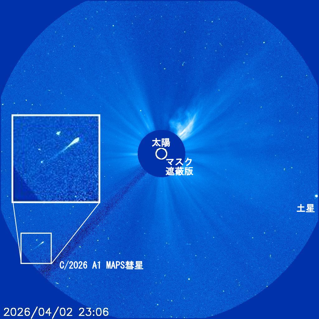 No.1600で示したようにMAPS彗星がコロナグラフ LASCO C3画像に写る様に太陽に近づきました。2026/04/04の近日点通過、太陽を周回するのは04/04~04/05の間ですので昨日のARTEMIS計画のオリオン打ち上げのライブ視聴のようにこれらの日は集中して最新データで眺め楽しみたいと思います。以下、現時点の最新SOHO LASCO C3画像の記録です。