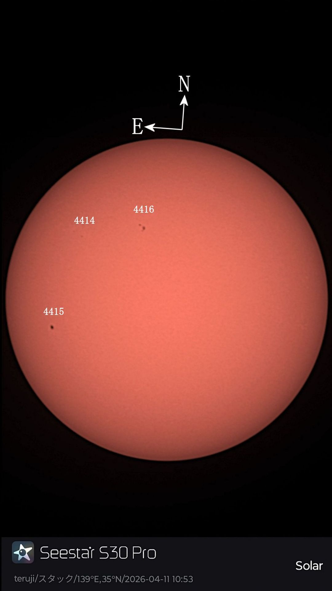 画像1 太陽 2026/04/11 10:53 Seestar S30Pro + 添付太陽フィルター アプリ内部ビデオスタックによる