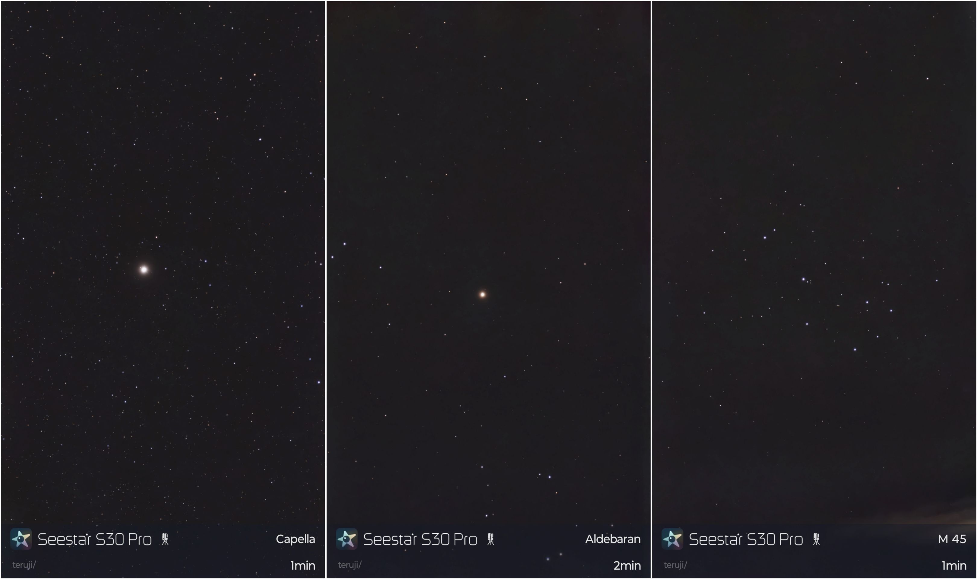画像2 星々 カペラ、アルデバラン、スバル 2026/04/20 左からそれぞれ19:58、20:02、20:19撮影