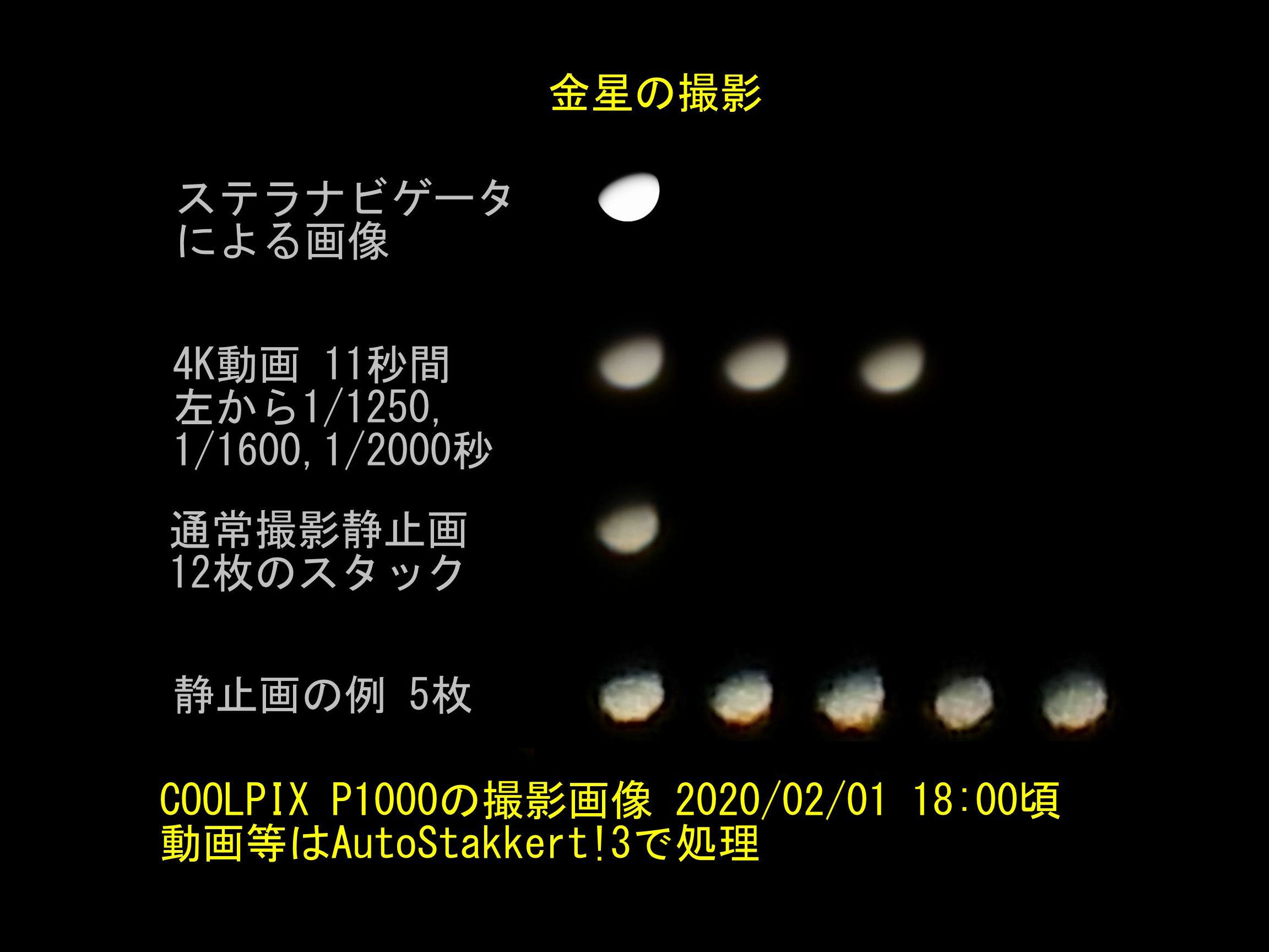 写真上段は撮影時間帯のシミュレーション画像です。大きさは任意。最下段はISO-100 3000mm×4倍デジタルズーム f/8 1/1600sと1/2000sです。2段目、3段目はAutoStakkert!3で動画は利用率50%、静止画は100%で処理。だいぶ月のように欠けてきました。表紙の金星の写真は動画1/2000sを拡大処理したものです。