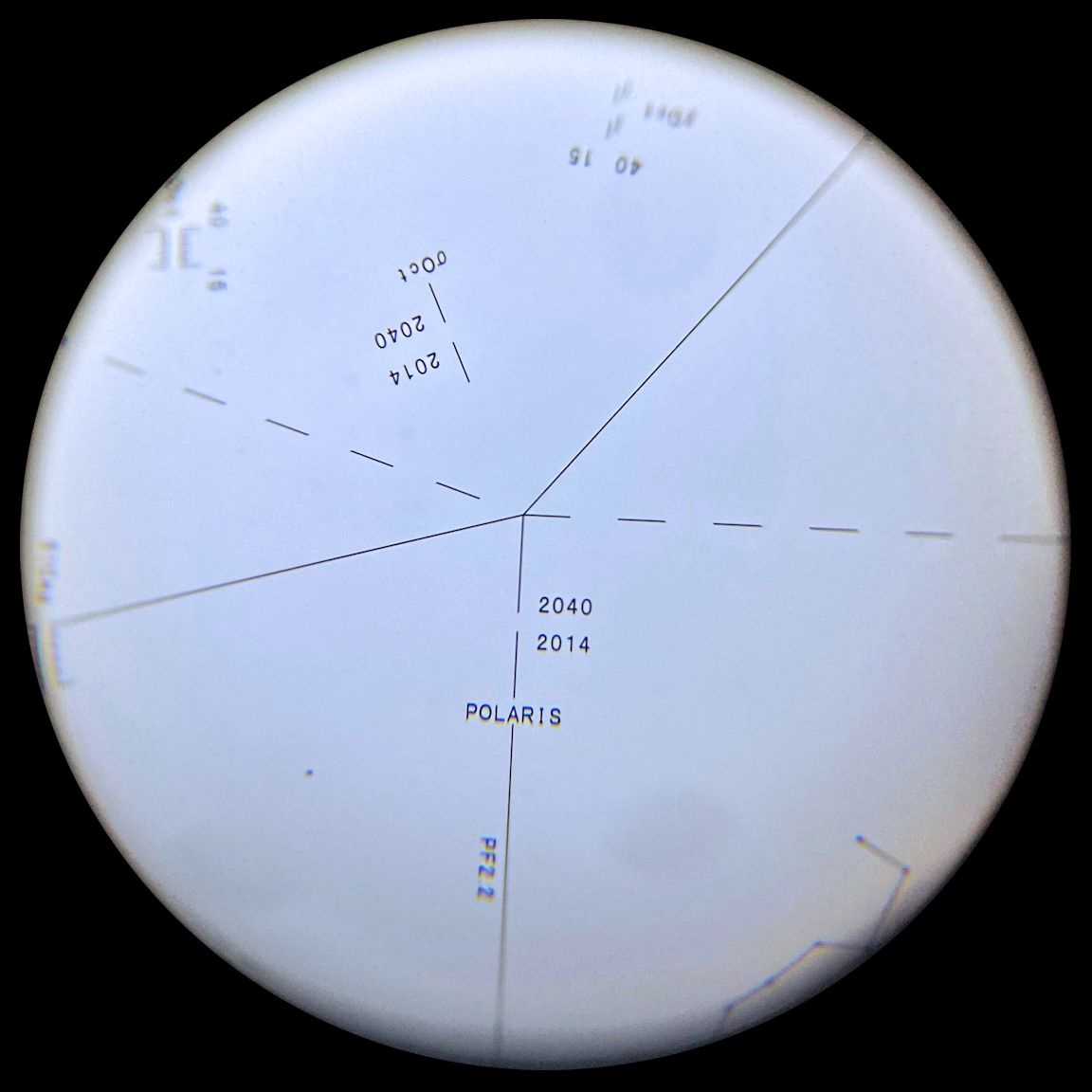 極軸望遠鏡による極軸合わせは、ポラリエのホットシューに取付けたVixenのポーラメーターを利用して北極星を視野内に導いた後、極軸望遠鏡内の恒星パターンに合致するように微動雲台で追い込む方法を適用してきました。