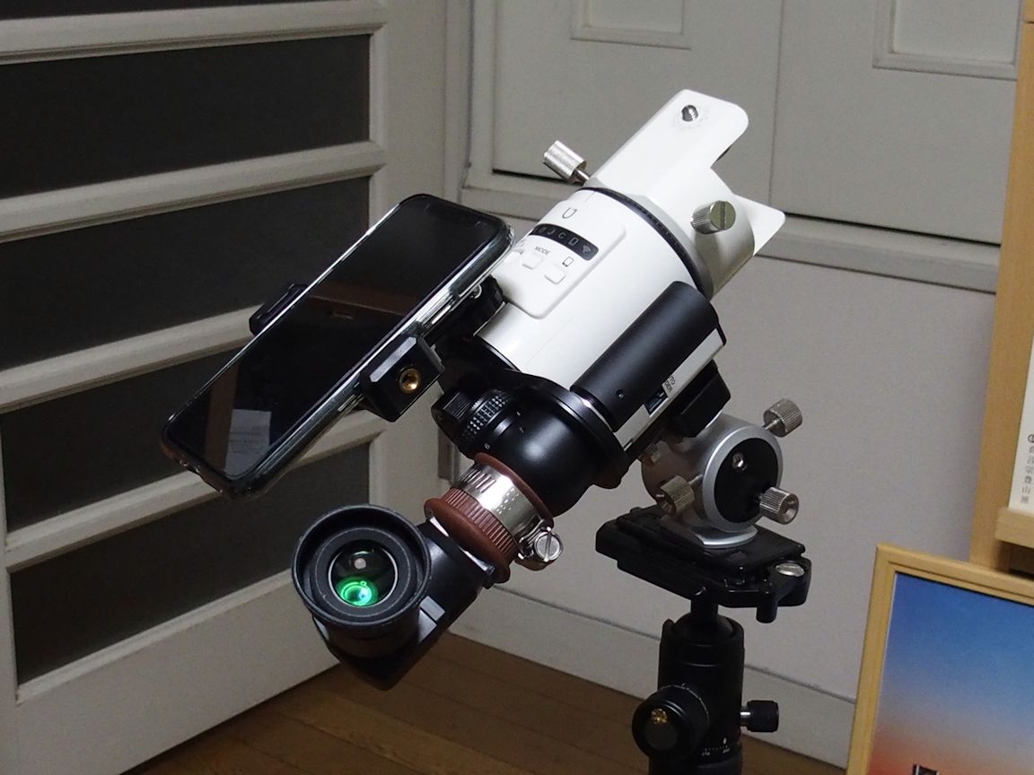 写真で見られるとおりスマートではないのですが、夜に使用するものなので、あまり外観はこだわらずにしました。ポラリエU等の本体関係を除くと、追加したのは極軸望遠鏡を覗くためのアングルファインダーで、それにプラスしてポーラメーター代わりにスマホ+Astro Locatorにしたことです。なお、下記の写真でポラリエUがVixen ポータブル赤道儀 極軸微動雲台に載せられていますが(原形状のままでコマを利用した方法では載せられません)、これについては同様に少し細工してNo.675にまとめています(これとは別にコマ部分の奥にあるネジ利用でも対応できます)。